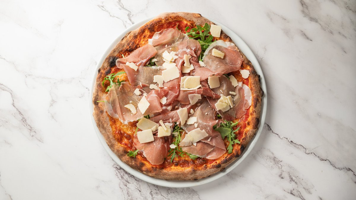 Tomatsovs, mozzarella fior di latte, rucola, parmaskinke, parmesan og olivenolie.