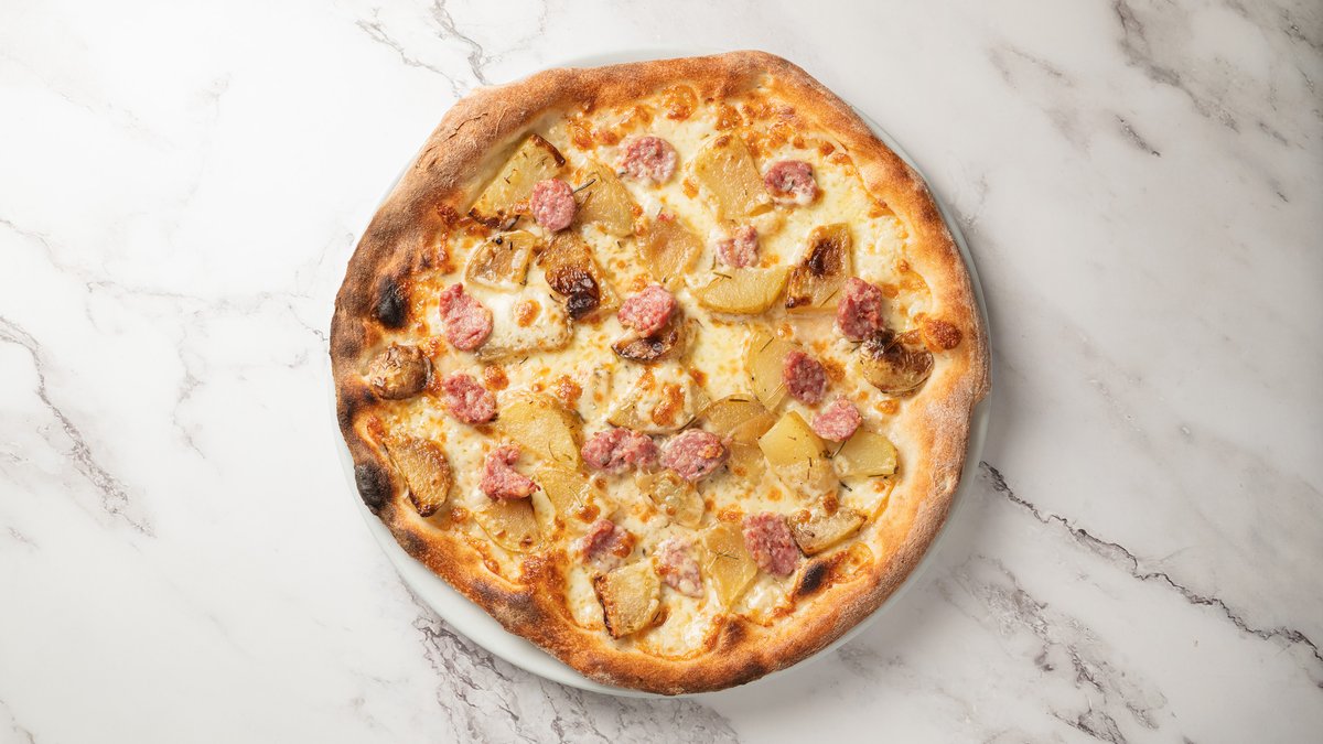 Mozzarella fior di latte, ovnstegte kartofler m. rosmarin, hvidløg, salsiccia og scamorza (røget mozzarella).