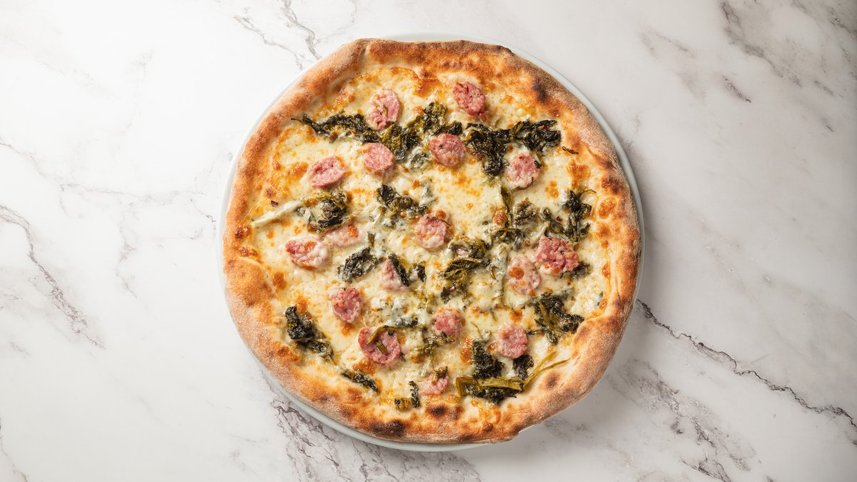 Mozzarella fior di latte, salsiccia (italiensk krydderpølse) og friarielli (napolitanske broccoli).