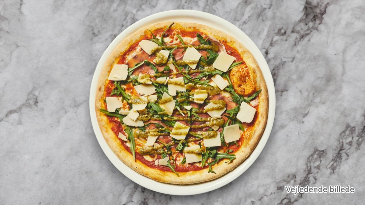 Tomatsauce, ost, oregano, skinke og pepperoni.
