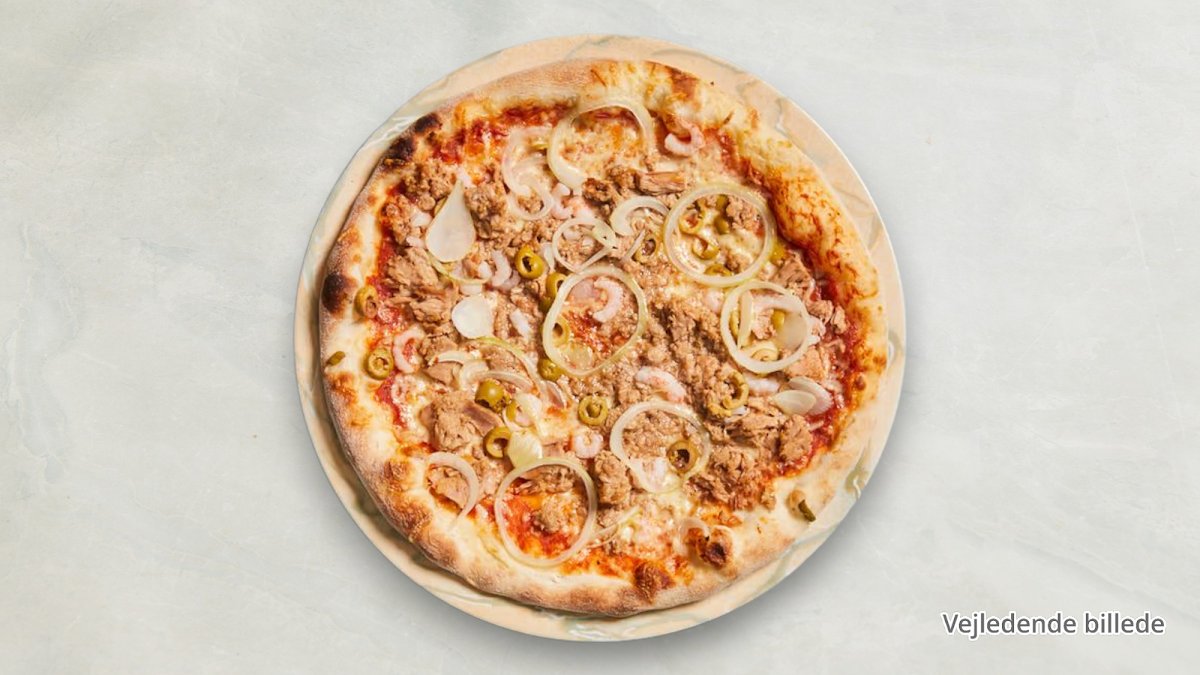Tomatsovs, ost, oregano, sujuk, løg og oliven.