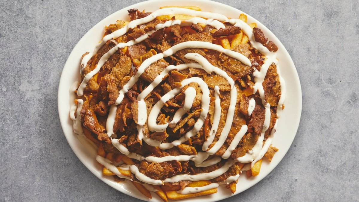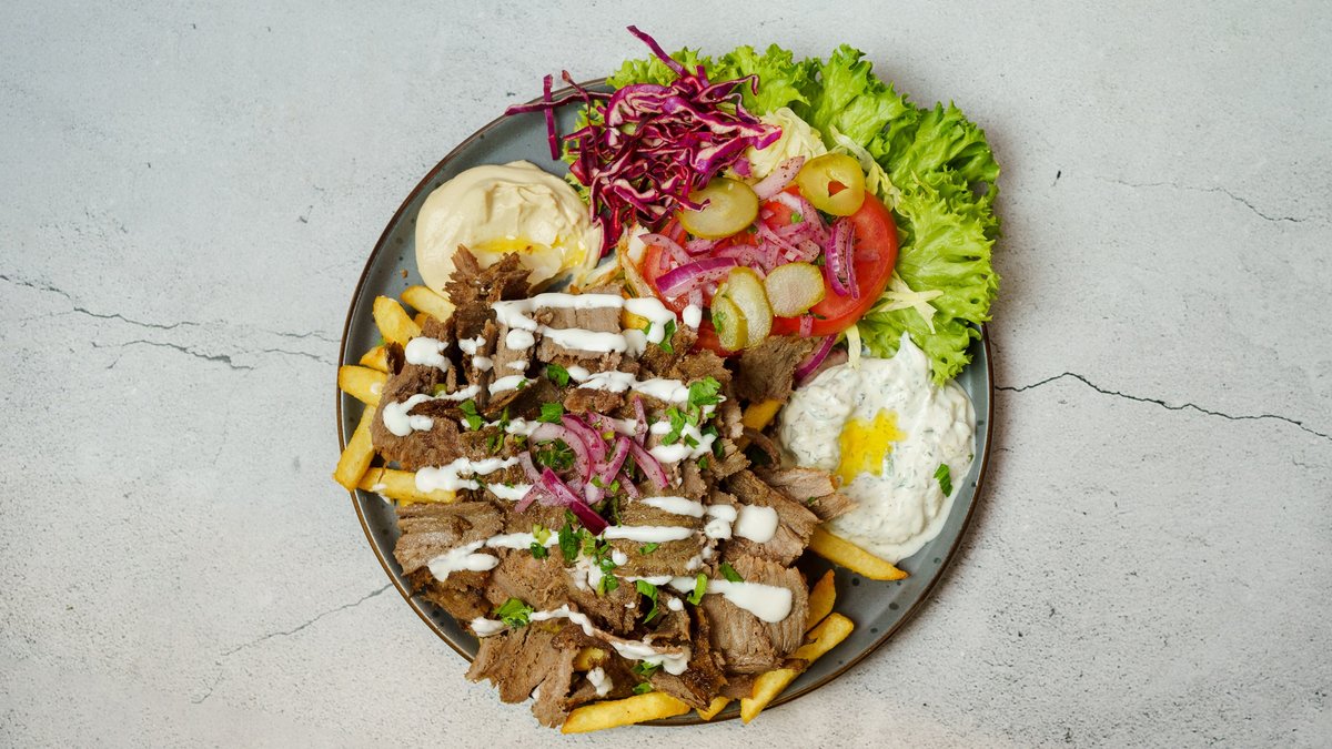 Berliner döner med pommes frites, salatblanding og toppet med doner-sauce.
