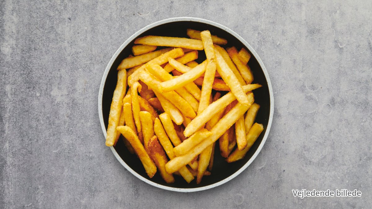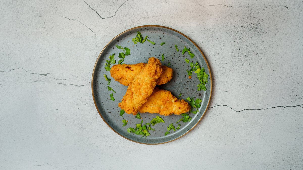 4stk Crispy chicken serveret med pommes frites og ketchup.