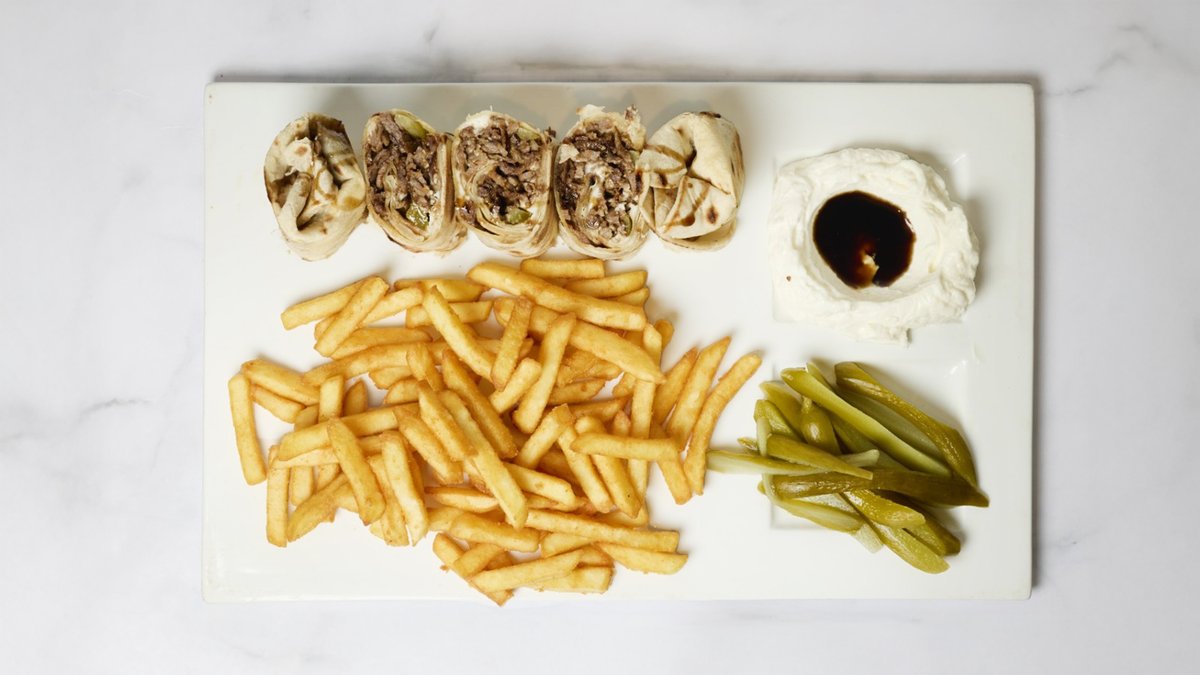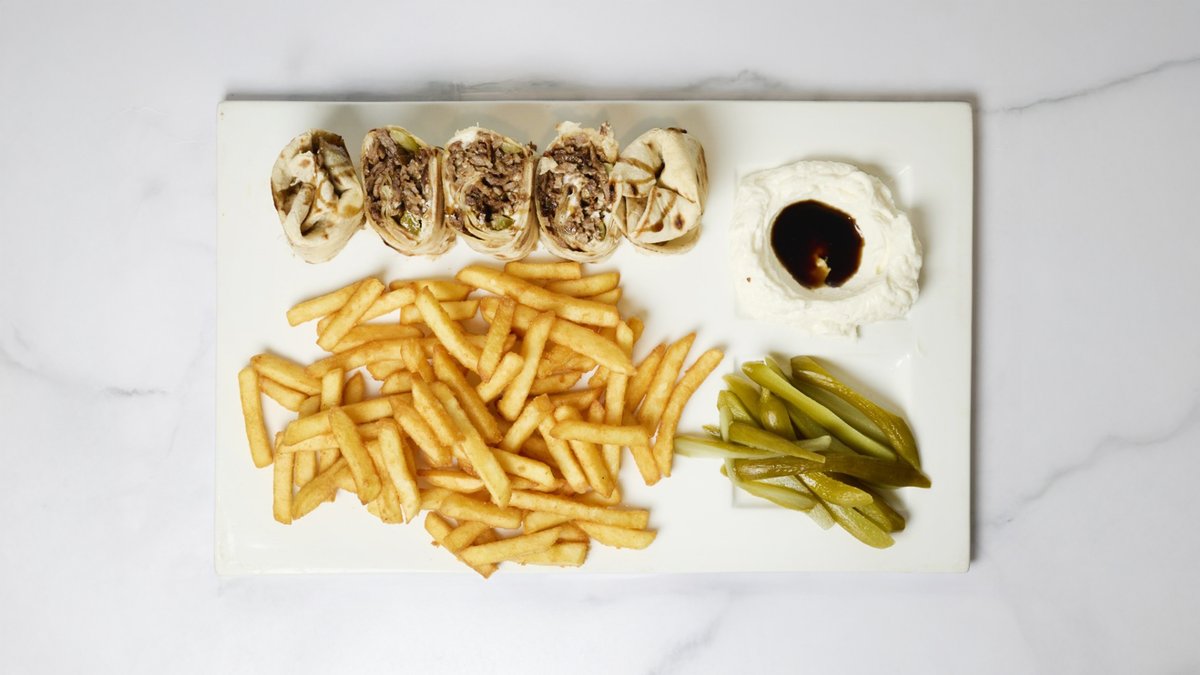 Ristet fladbrød skåret i skiver, fyldt med shawarma,tomat, løg med persille, syltede agurker, granatæble sauce og smurt med hvidløgsmayo, serveres med pommes frites.