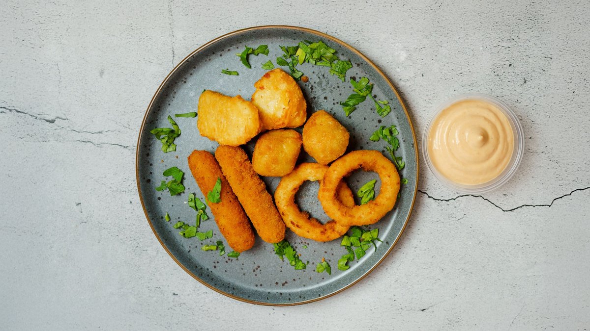 2x Mozzarella sticks 2x Chili cheese 2x Onion rings 2x Chicken nuggets Serveres med dyppelse.