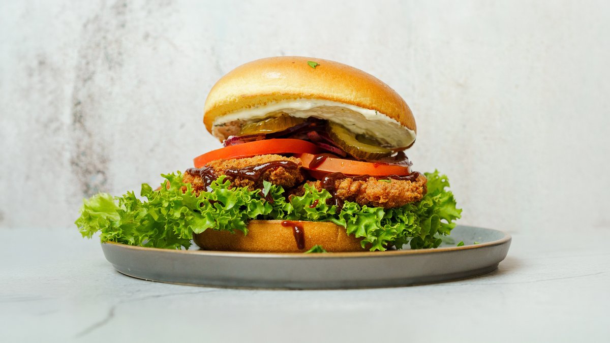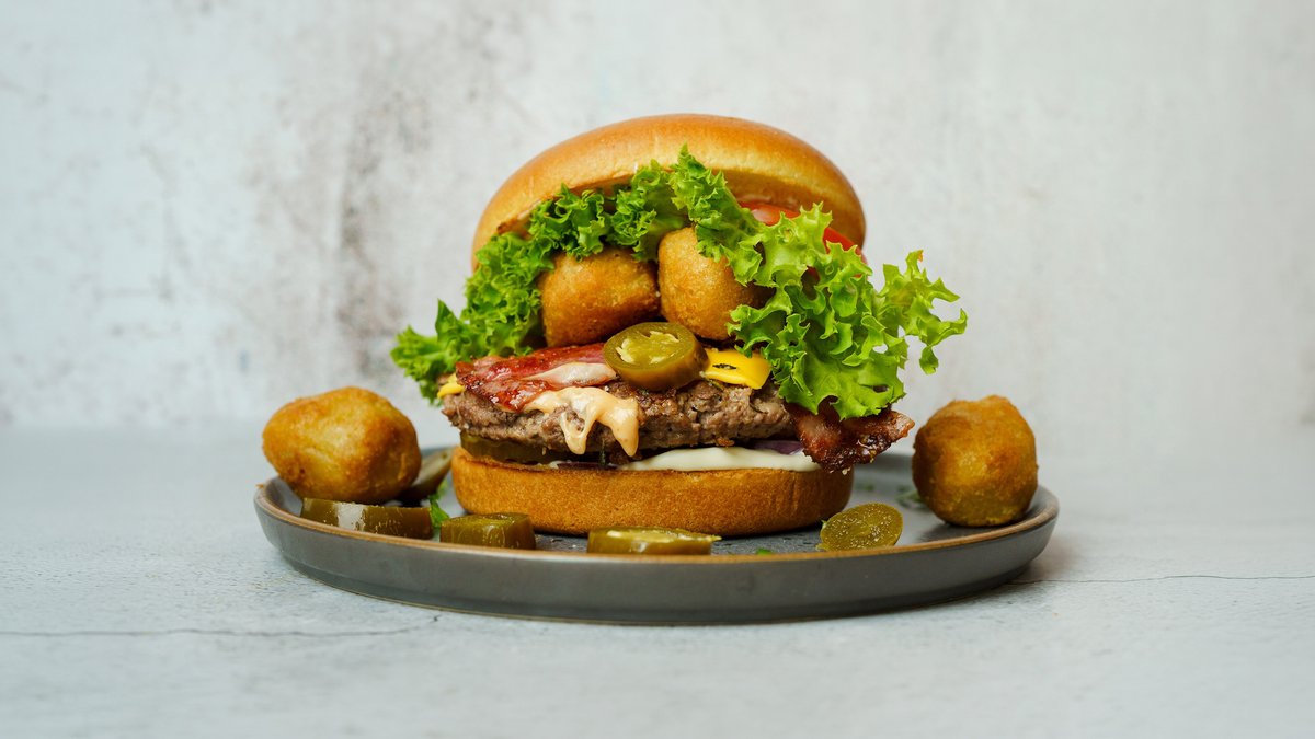 Briochebolle med fyld af crispy bøf smurt med mayo, cheddarost, salat, tomat, rødløg, pickles og dressing, serveres med pommes frites.