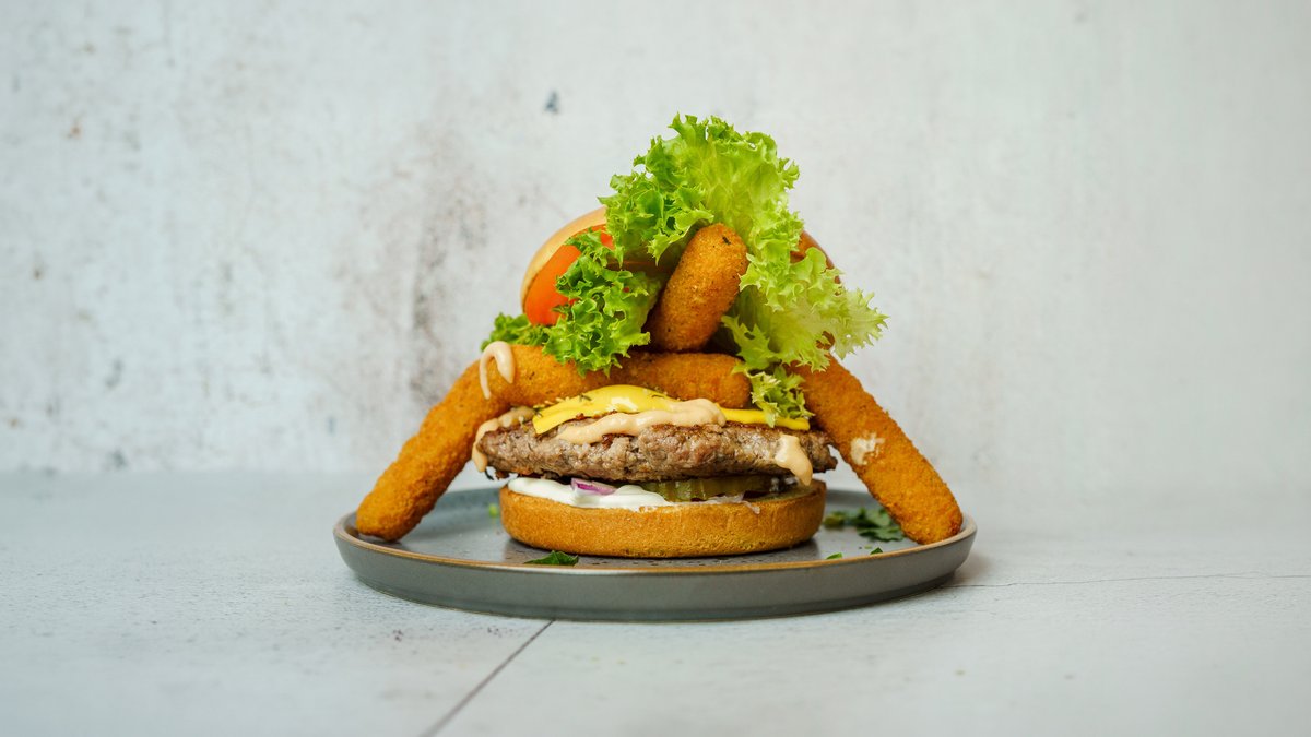 Briochebolle med fyld af bøf smurt med mayo, cheddar, 2stk mozzarella sticks, salat, tomat, rødløg, pickles og dressing, serveres med pommes frites.