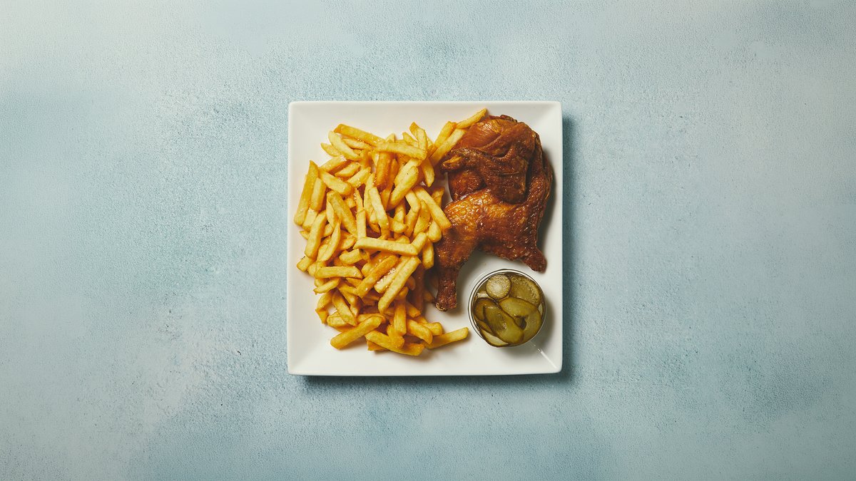 Friturestegt halvkylling, pommes, syltede agurk, hjemmelavet hvidløgsmayo og salat blanding.