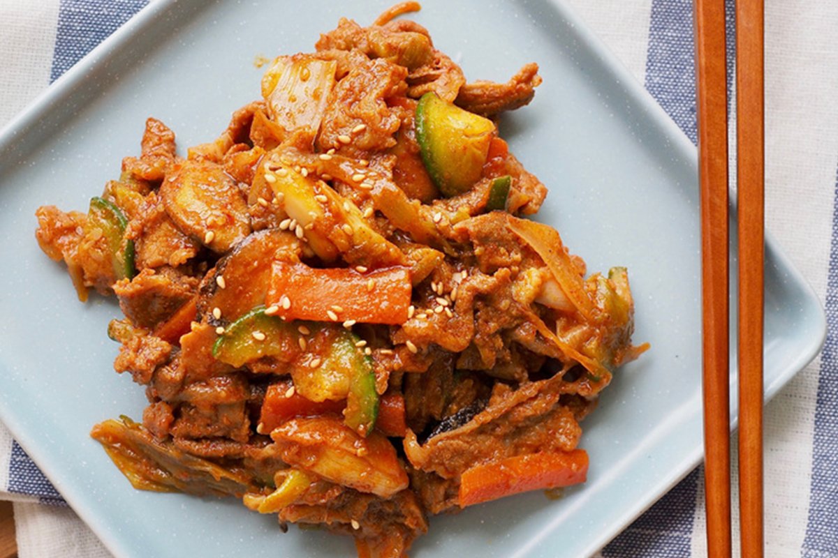 Koreansk stir-fry med svinekød i krydret gochujang-sauce.