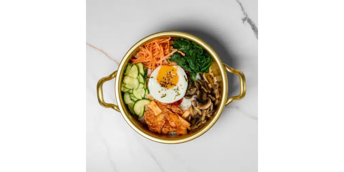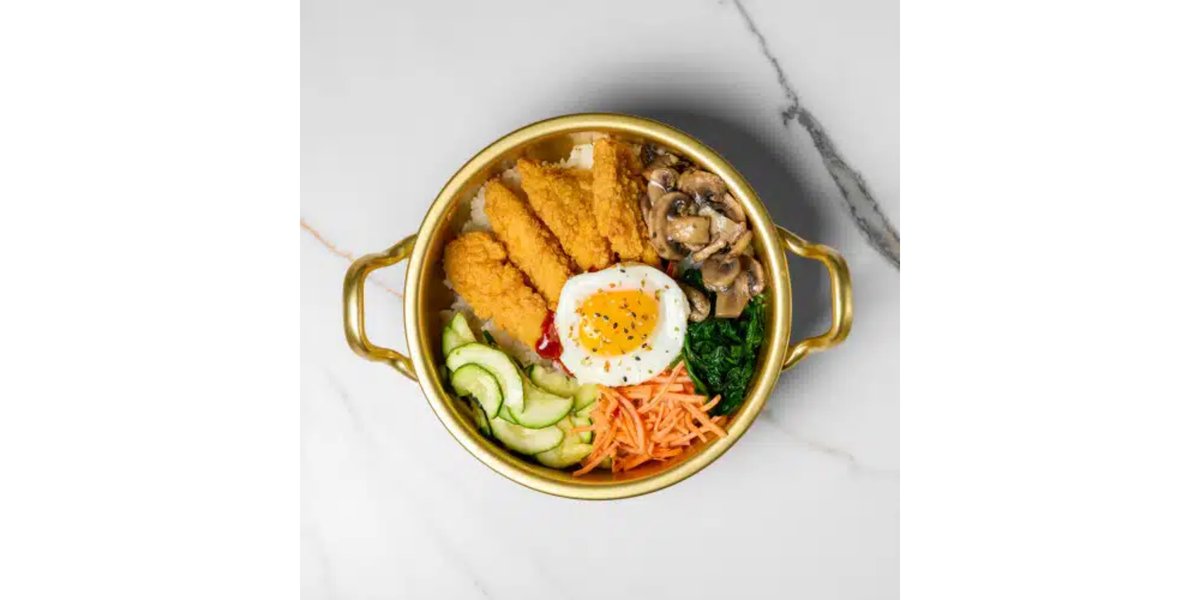 Ris, friske grøntsager, mørt kyllingekød, spejlæg og krydret gochujang.