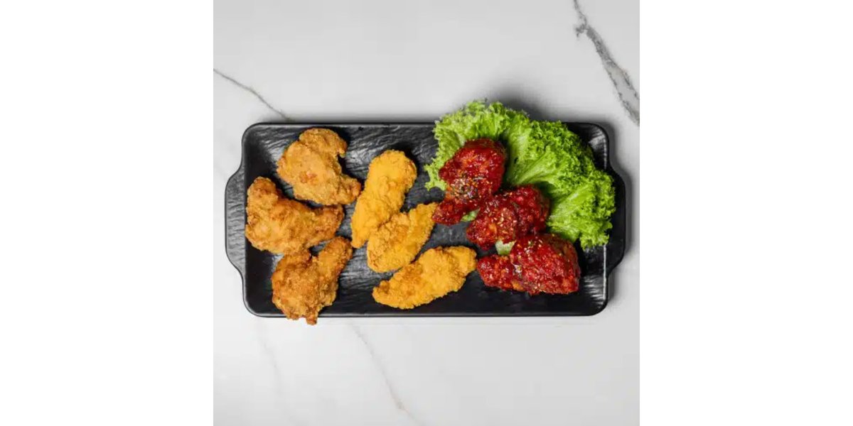 1x Vegetarpandekage 4x Forårsruller 1x Kimchi 1x Agurksalat 4x Dumpings 1x Bulgogi 8x Kyllingevinger 2x Ris