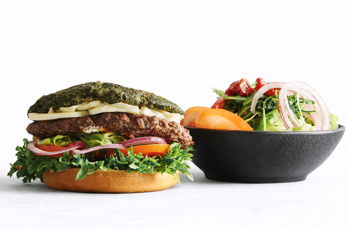 Grillet bøf af 160 gram oksekød, brødbund, grøntsagstop, salat, tomat, løg, salatmyo, kryddermayo, soltørrede tomater og mozzarella. Serveres med salat.