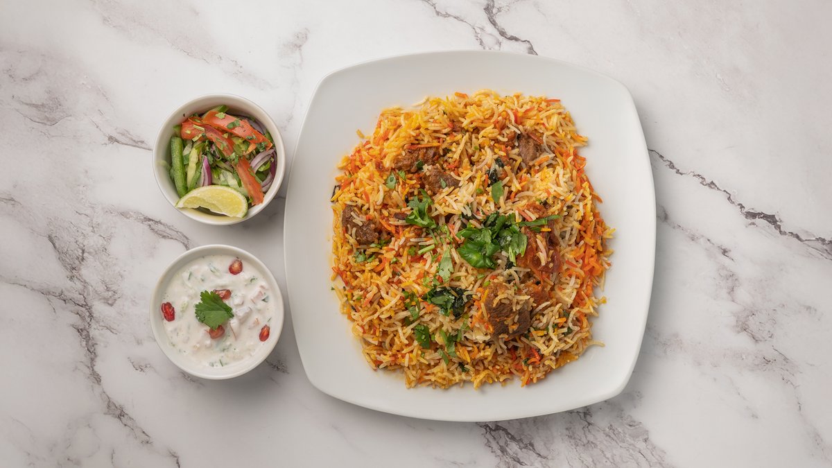 En traditionel risret tilberedt med duftende basmatiris, marineret saftig oksekød og aromatiske krydderier. Serveres med salat og raita.