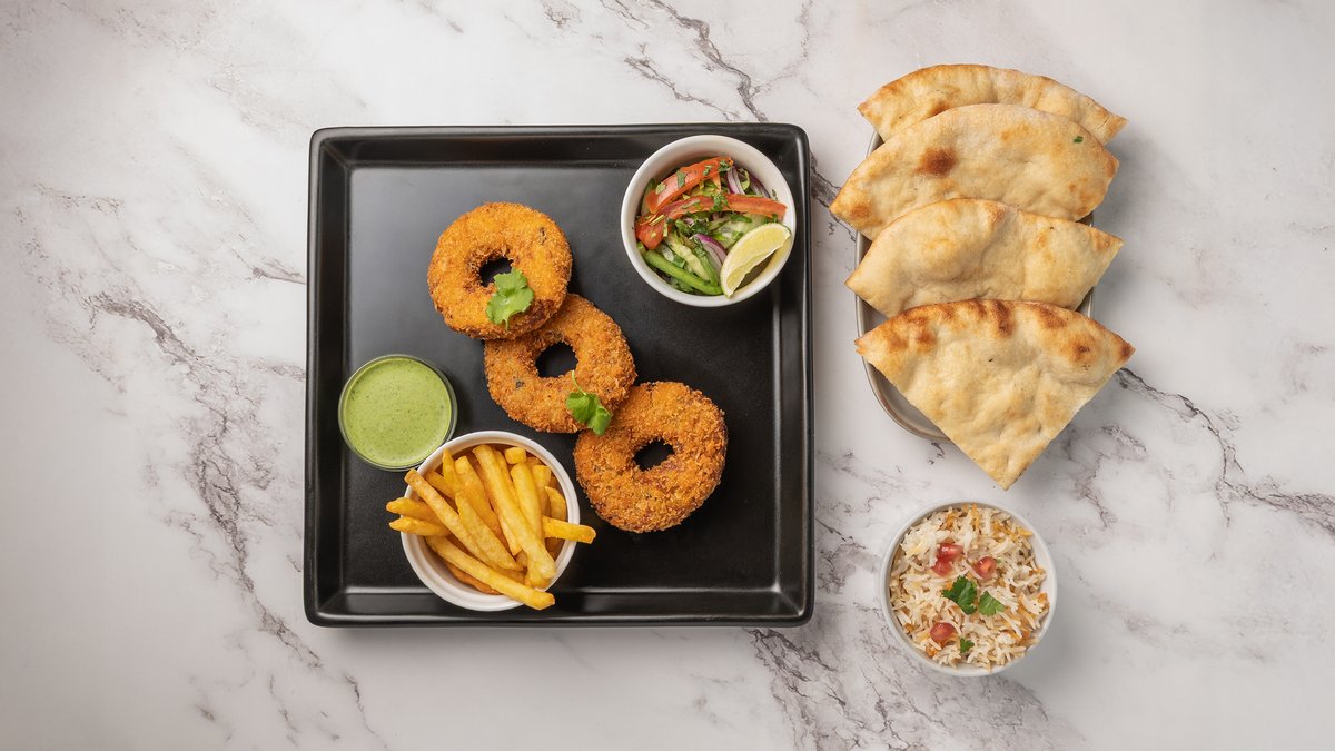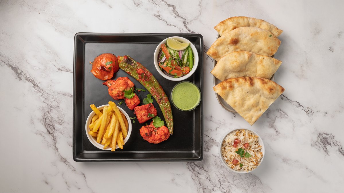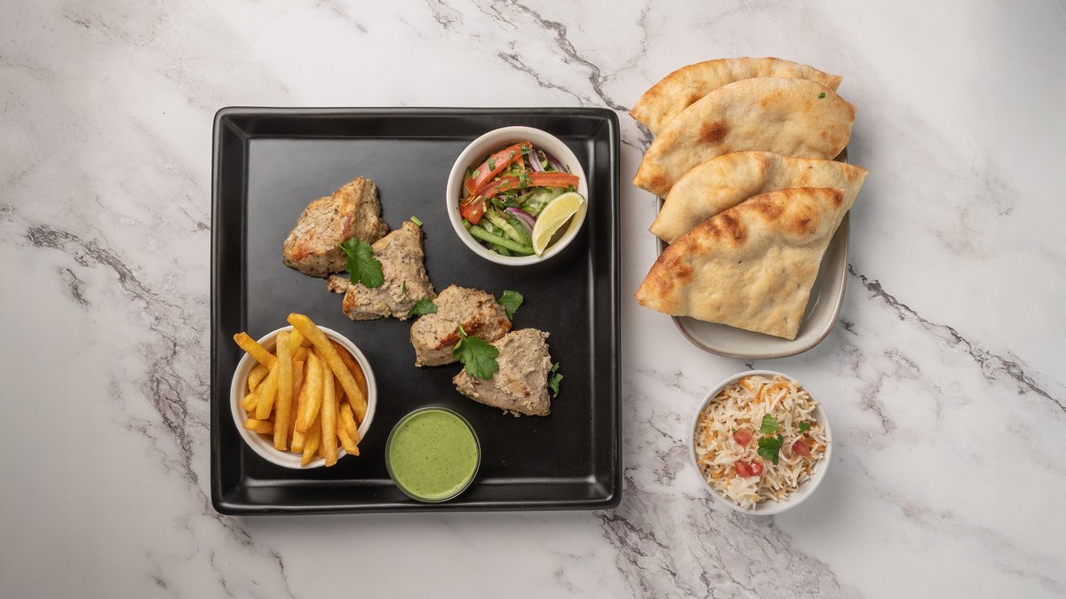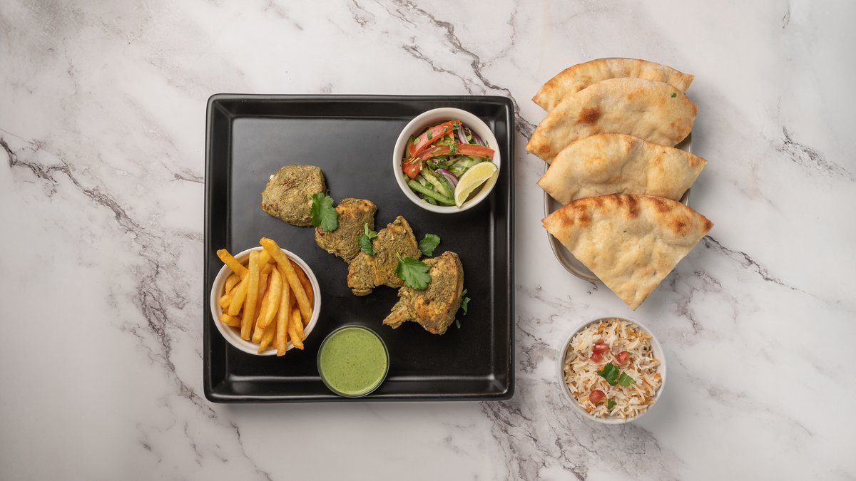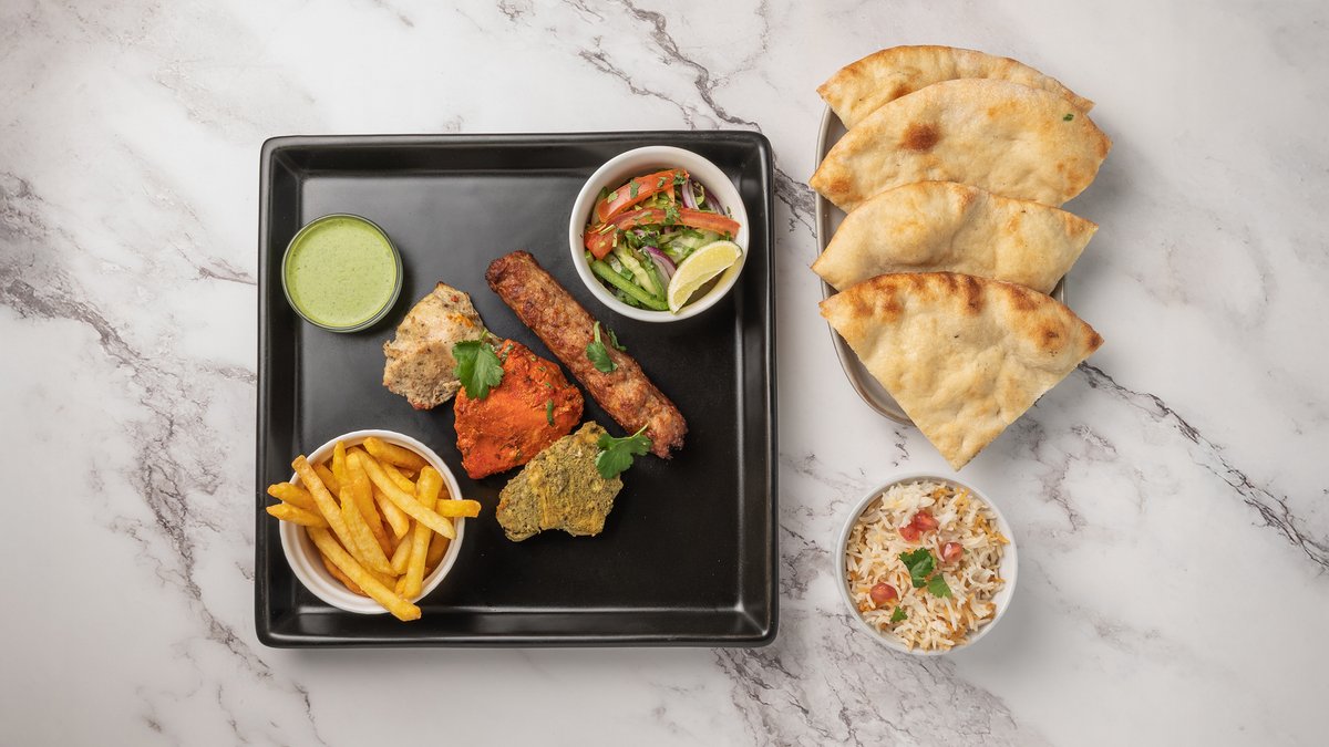 2 stk. Tandoori kylling 1 stk. Malai boti 1 stk. Hariyali kylling 1 stk. Kebab serveret med pommes frites, valgfrit tilbehør og dyppelse.