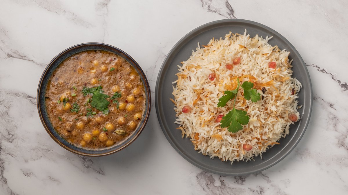 Krydret kikærtekarry tilberedt med tomat, løg, ingefær og krydderier. Serveres med ris eller naan.
