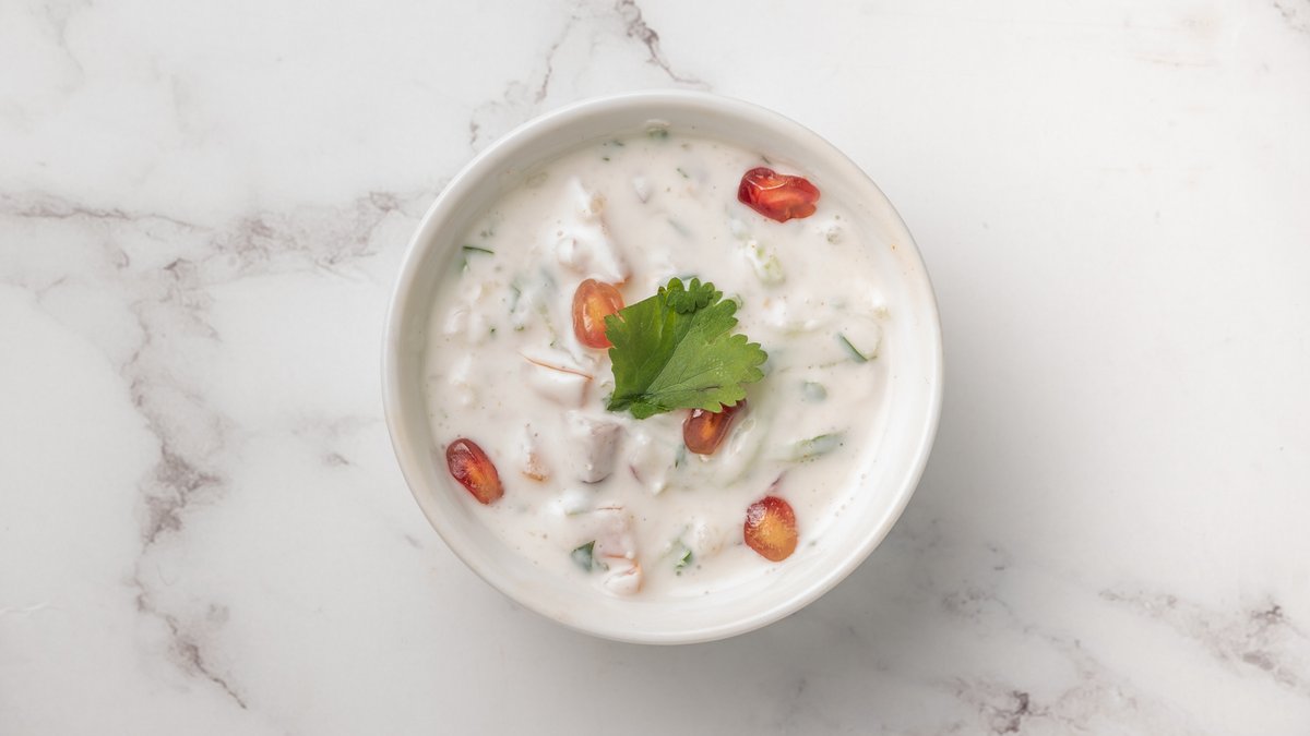 Cremet yoghurtsalat blandet med agurk, tomat, aromatiske krydderier og urter.