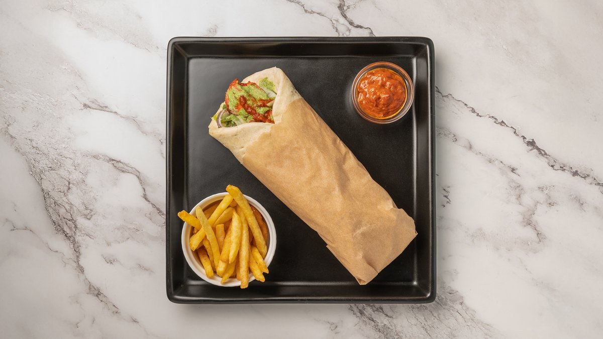 Naan sandwich med fyld af valgfri protein, serveres med pommes frites og en dyppelse.