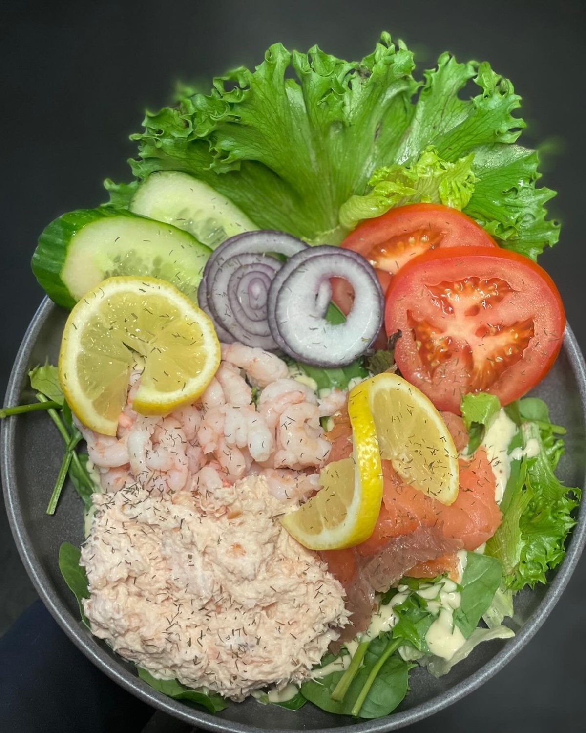 Blandet salat toppet med laks, rejer, varmrøget laksecreme, agurk, tomat, løg, citron med honning- og sennepsvinaigrette.