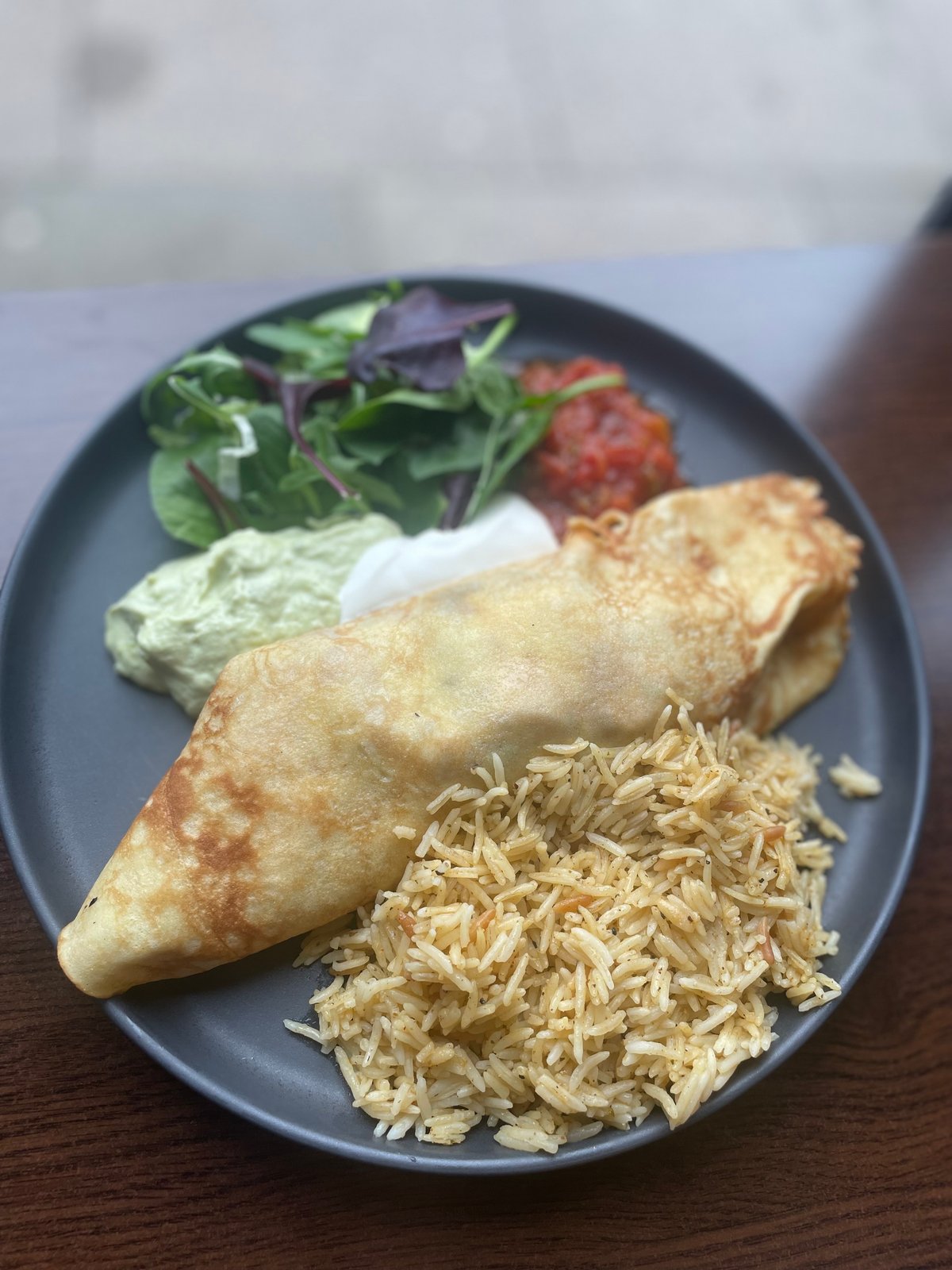Madpandekager med fyld af krydret kylling, ost, salsa, jalapeños, guacamole, champignon og peberfrugt. Serveres med ris, salat og creme fraiche.