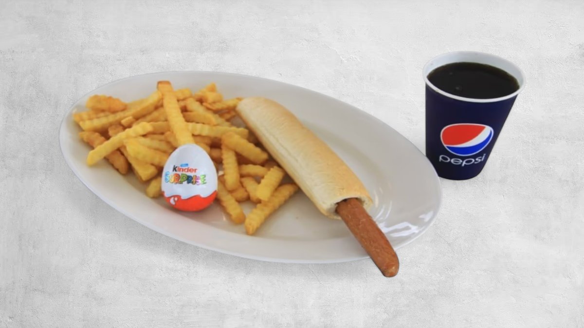 Serveres med pommes frites, saftevand og et kinderæg.