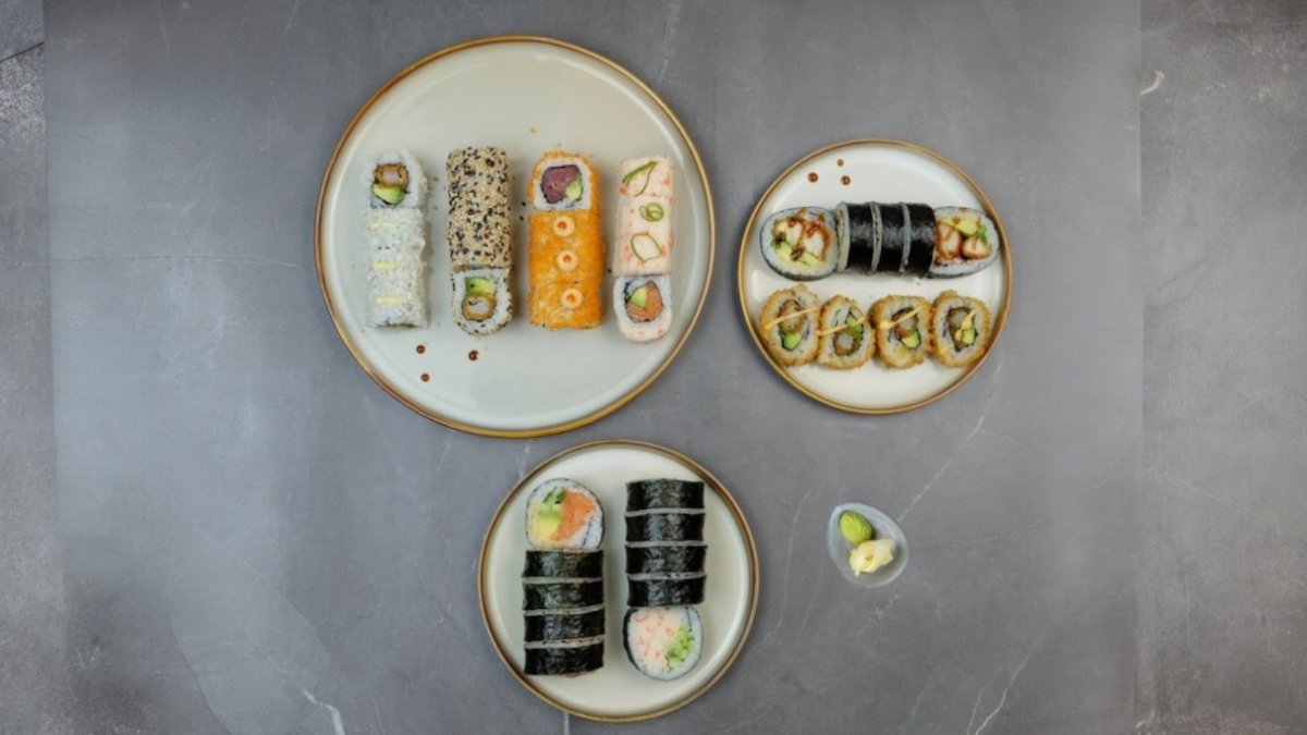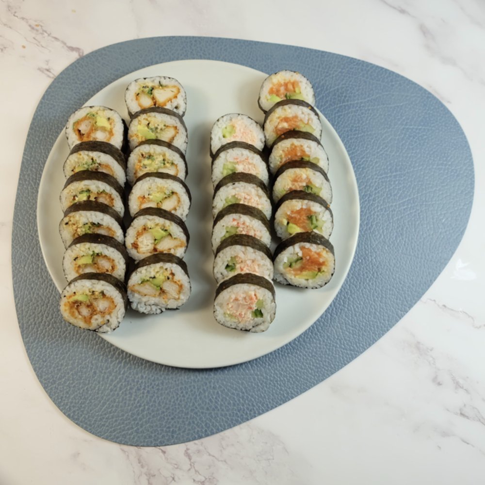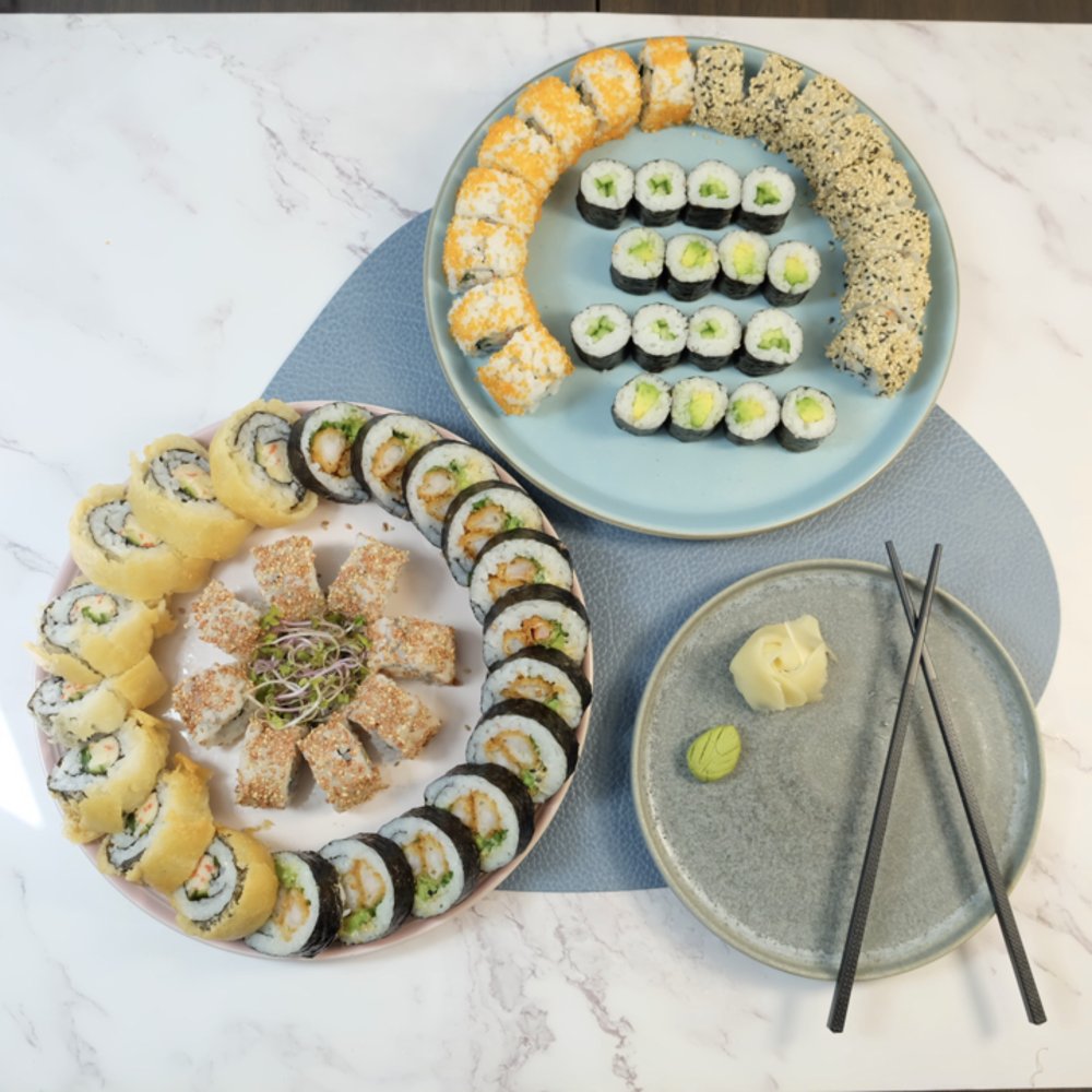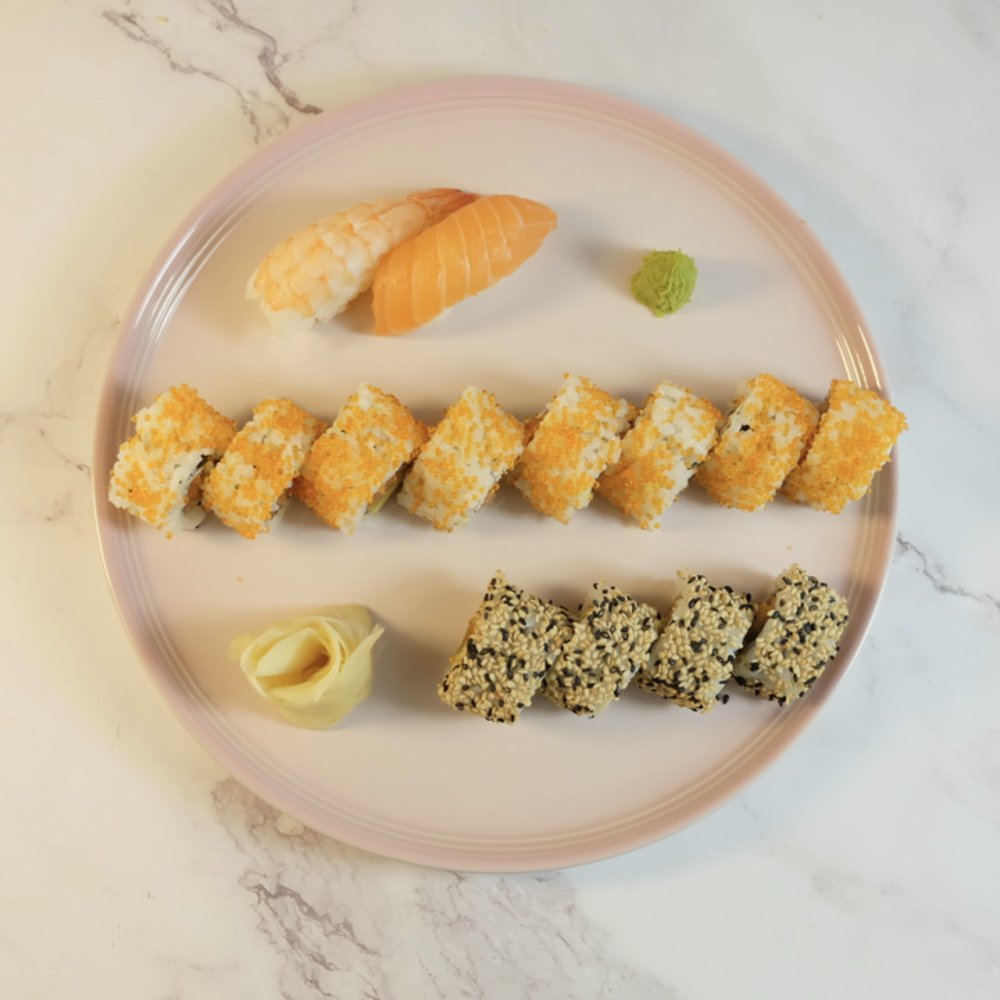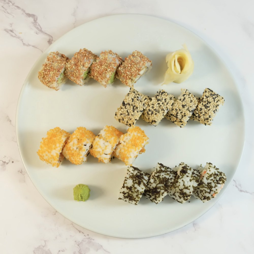 Uramaki: 8 x Crispy Ebi 8 x Marie Roll 8 x Crispy Kylling Kaburimaki: 8 x Ebi Crunch. Serveres med to valgfrie Hata Ramune sodavand.