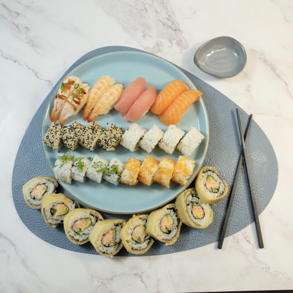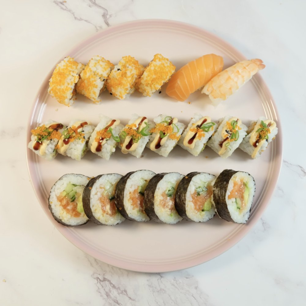 (Anbefales til 2-3 personer) Nigiri: 2 x Laks 2 x Tun 2 x Rejer 2 x Deluxe Grill rejer Futomaki: 6 x California 6 x Spicy laks 6 x Ebi Tempura Uramaki: 4 x Alaska 4 x Shake 8 x Crispy kylling 8 x River