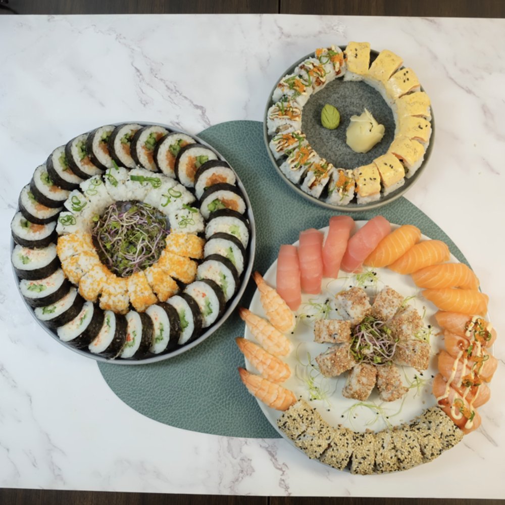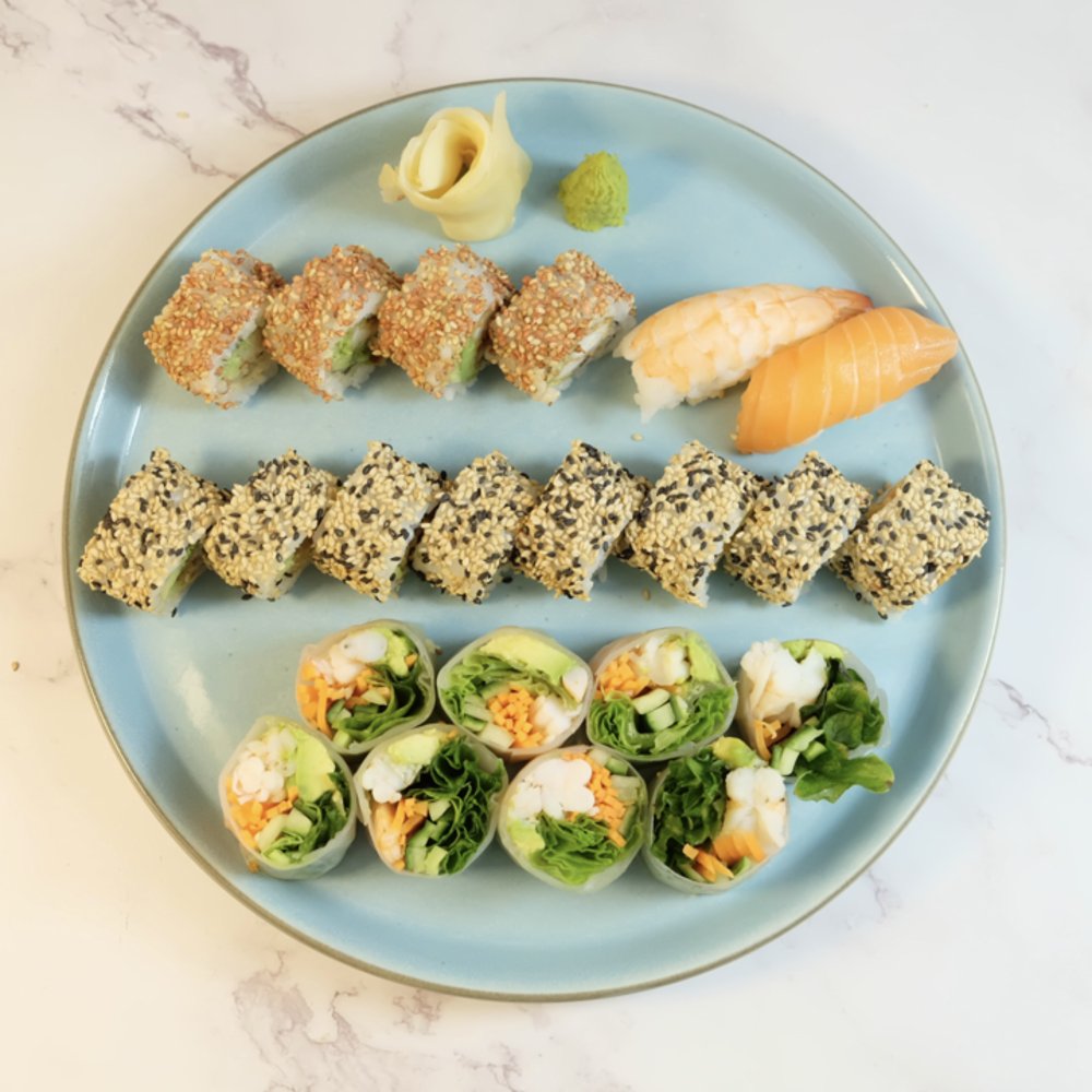 Forretter: 1 x Tangsalat 2 x Forårsruller 2 x Japanese Stylerejer 2 x Kylling Nuggets 2 x Mozzarella Finger 2 x Kyllingesticks 2 x Rejesticks Uramaki: 4 x Crispy Kylling 8 x Crispy Ebi 8 x Marie Roll Kaburimaki: 4 x Fire Roll 4 x Super Tempura Hosomaki: 8 x Agurk Serveres med to valgfrie Hata Ramune sodavand. Anbefales til 2-3 personer.