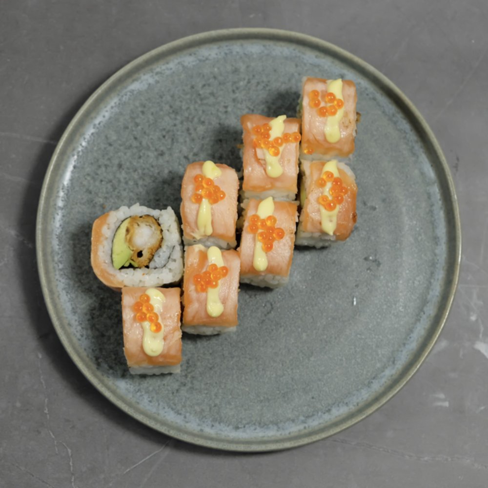 Tempura reje, avocado, spicy dip, teriyakisauce, sesam, forårsløg og tobiko.