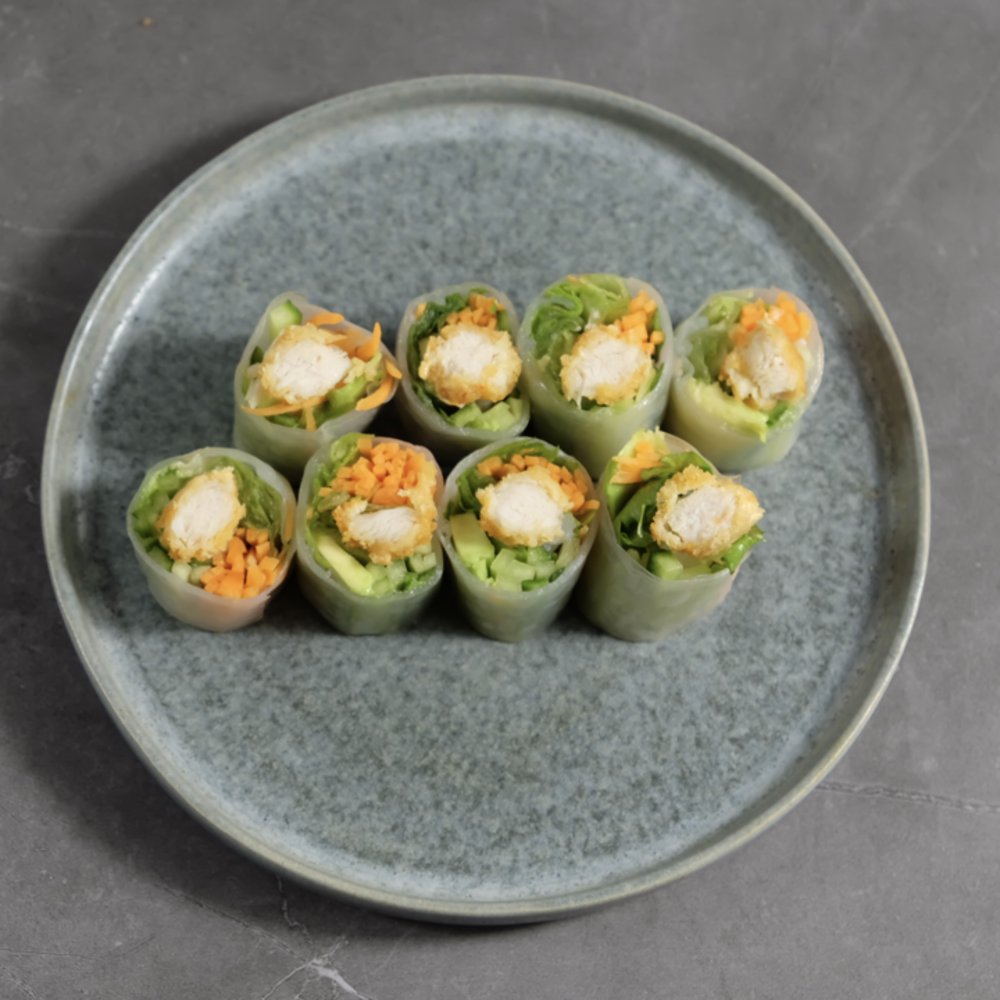 Indbagt kylling, icebergsalat, agurk, gulerod, gomadressing og avocado. I rispapir.