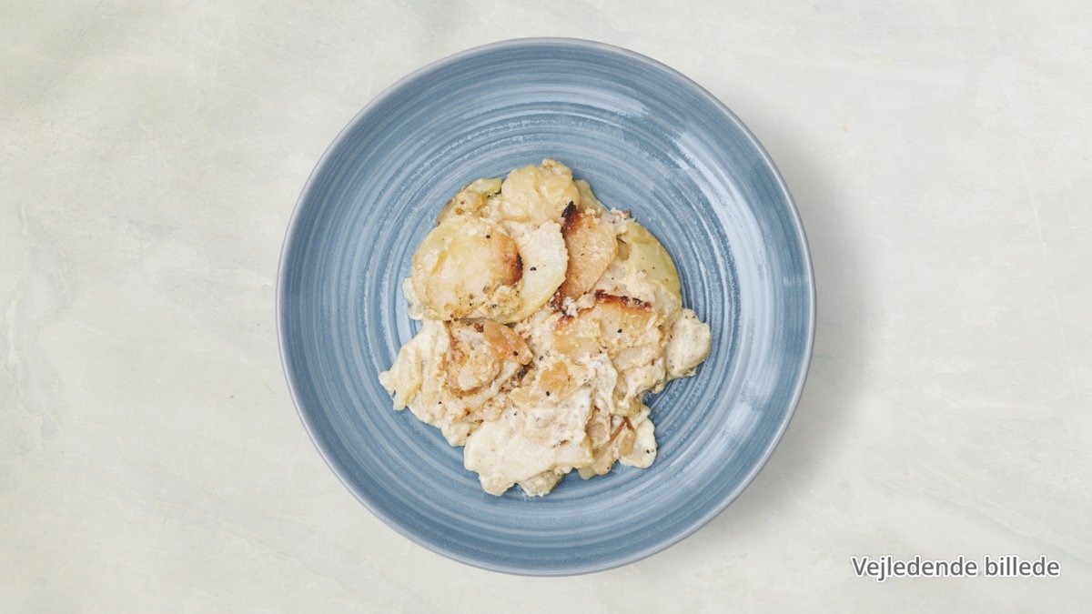 Flødekartofler med ost, hivdløg og fløde.
