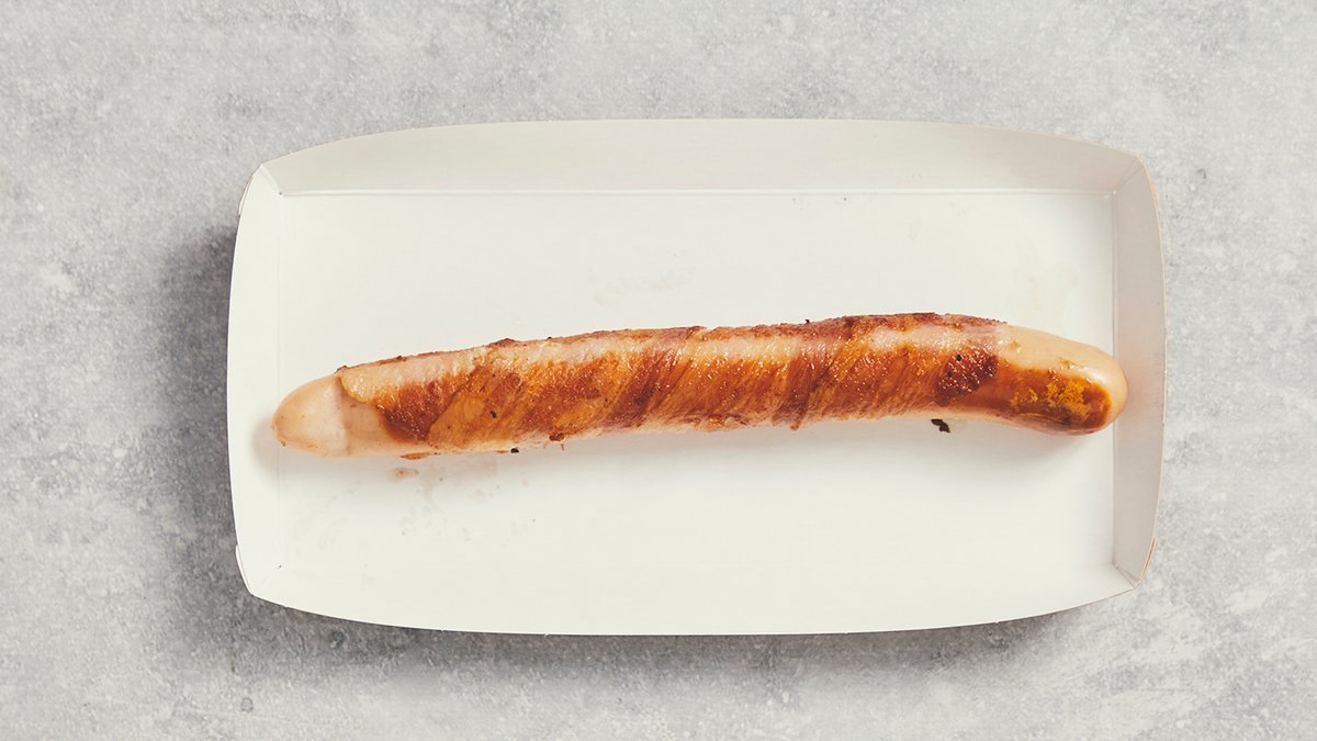 Oksekødsbøf i blød bolle smurt med mayo med fyld af bacon, iceberg, løg, agurk, ketchup og creme fraiche.
