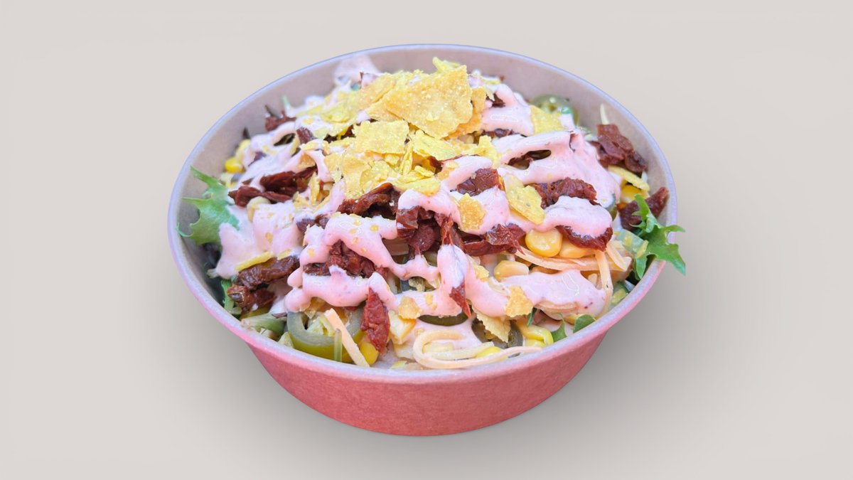 Salat, agurk, majs, cheddarost, kylling, soltørrede tomatar, chipotlemayo, jalapenos, nachos krymmel