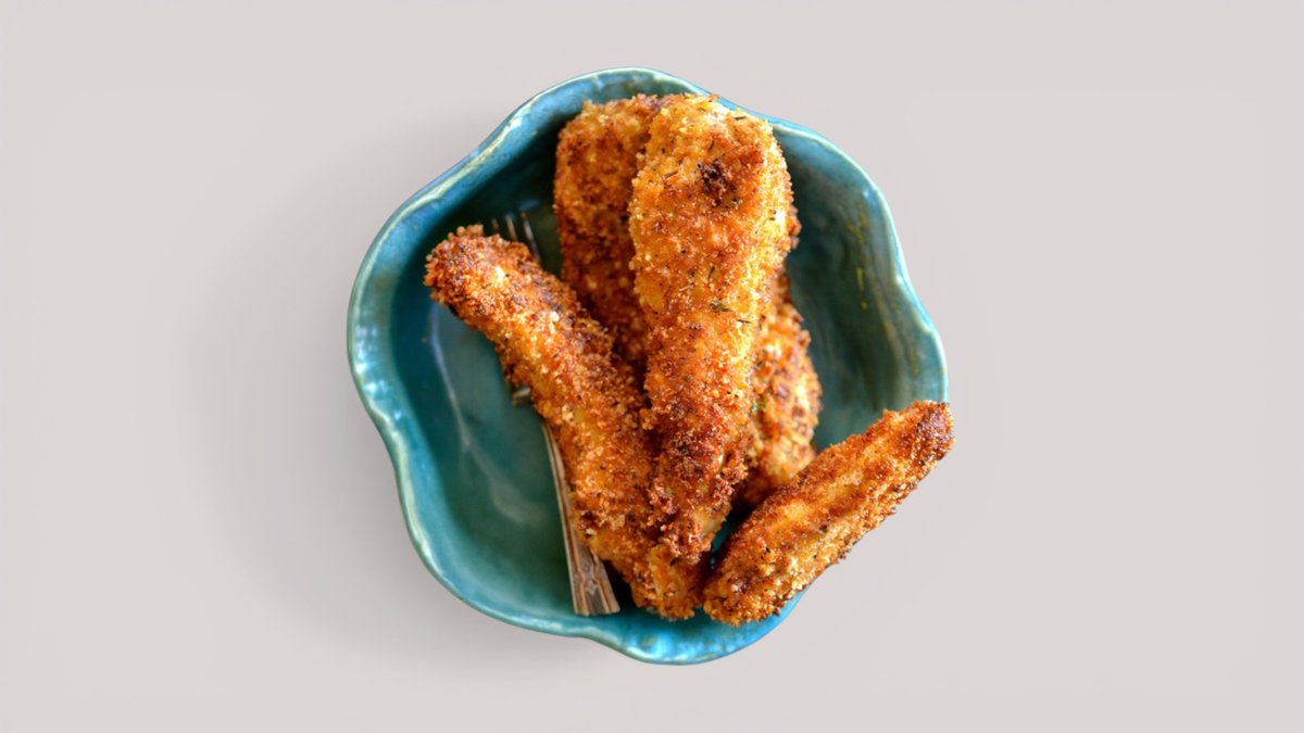 Kyllingeinderfiltet serveret med pommes frites, ketchup og remoulade.