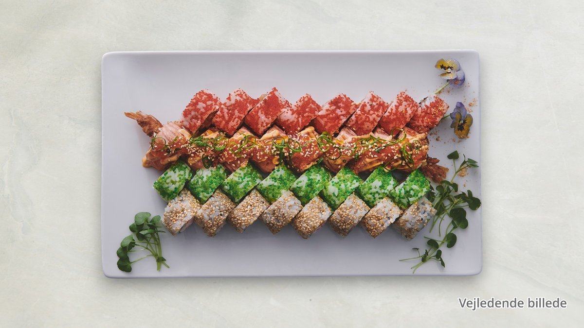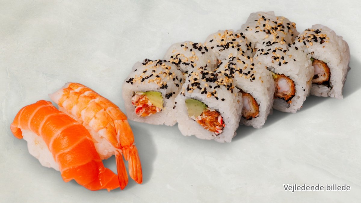 8x Green Dragon - Tempura reje, chili mayo, avocado, sesam og teriyakisauce. 8x Tokiyo - Tempura reje, avocado, chili mayo, teriyaki sauce og luciennespirer toppet med laks. Nigiri 2x Flamme grillet laks nigiri 2x Flamme grillet tun nigiri 6x Futomaki Urimaki (inside-out) 8x Spicy tuna 8x California 8x Alaska
