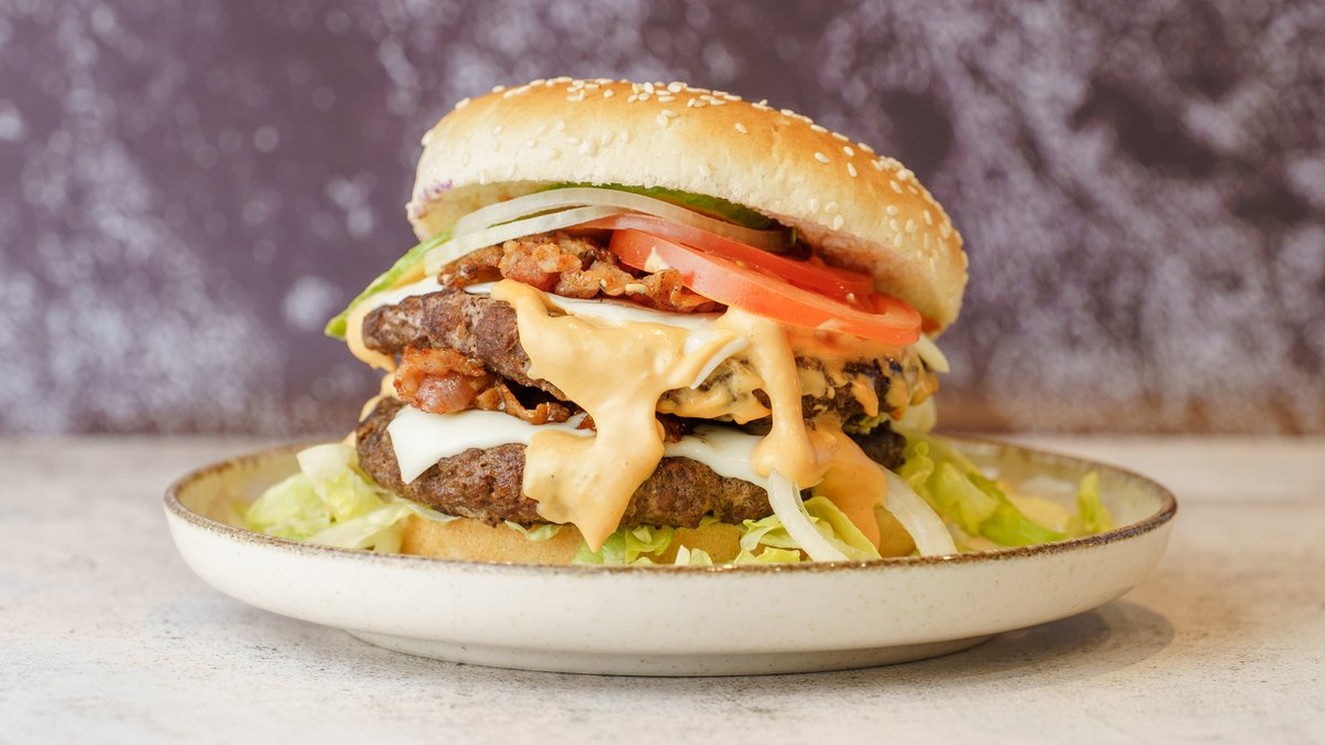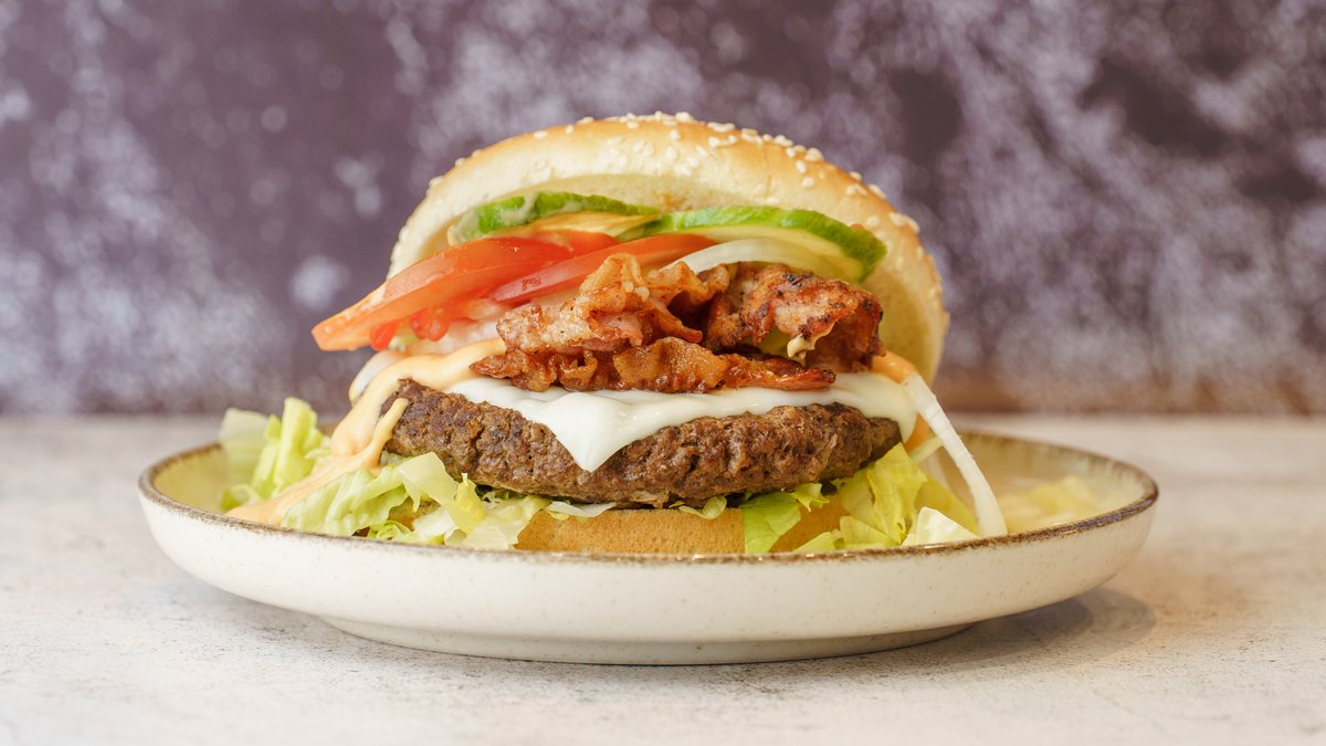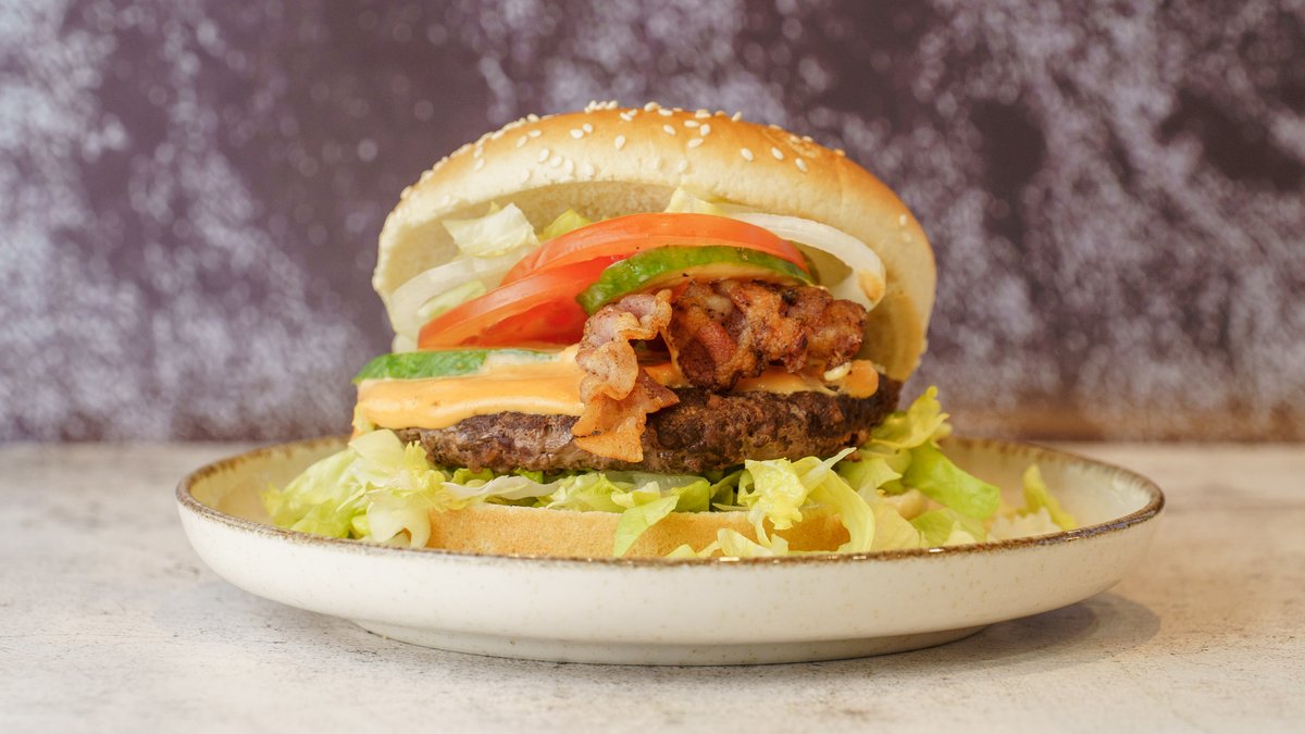 Burgerbolle med bøf, bacon, salat, tomat, løg agurk.
