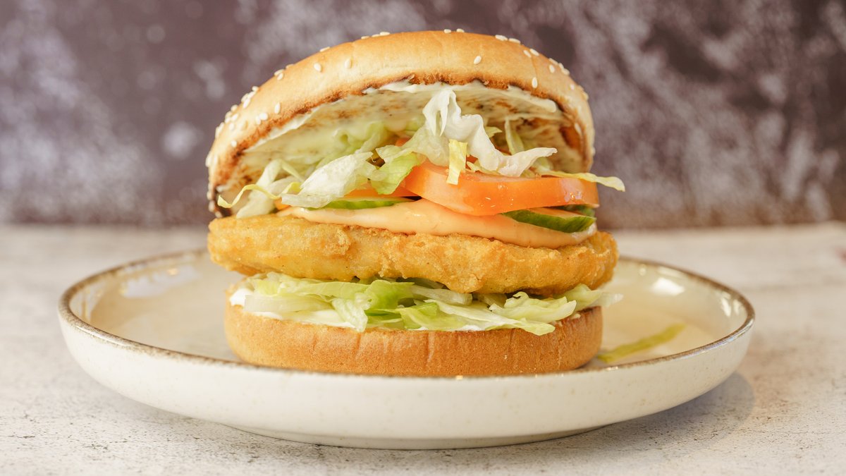 Burgerbolle med kylling, salat, tomat, løg agurk.