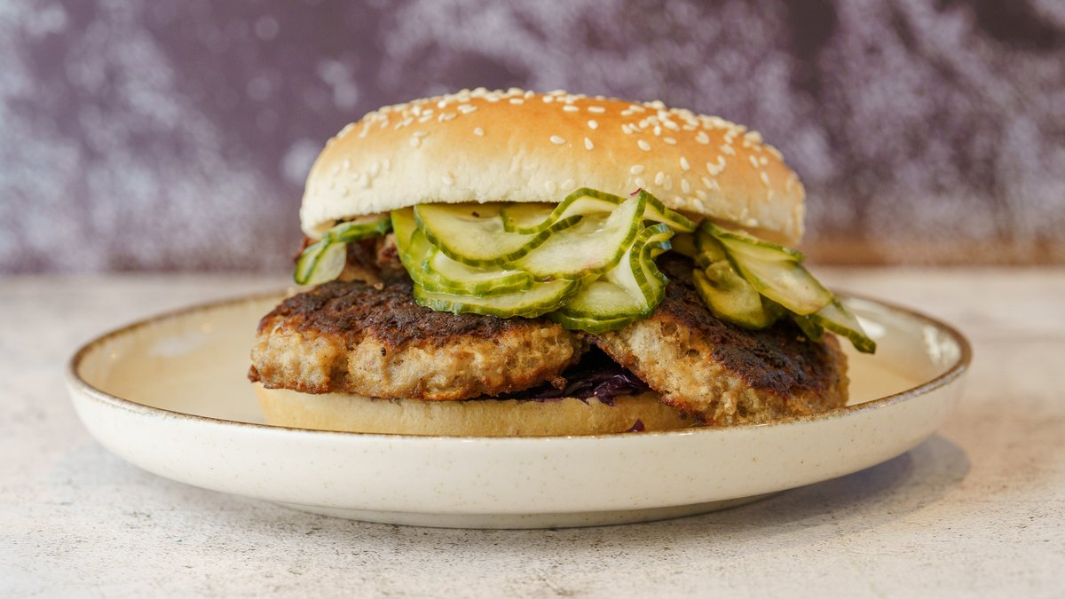 Sandwichbrød med frikadelle, rødkål, agurkesalat og mayonnaise.