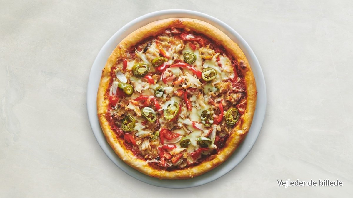 Tomatsauce, ost, kylling, pepperoni, bacon og cocktailpølser.