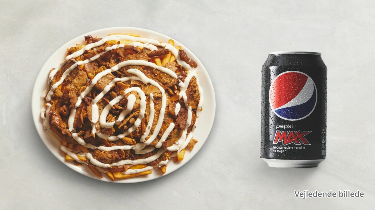 Serveret med pommes frites, salatmayonnaise og valgfri 0,33 l sodavand.