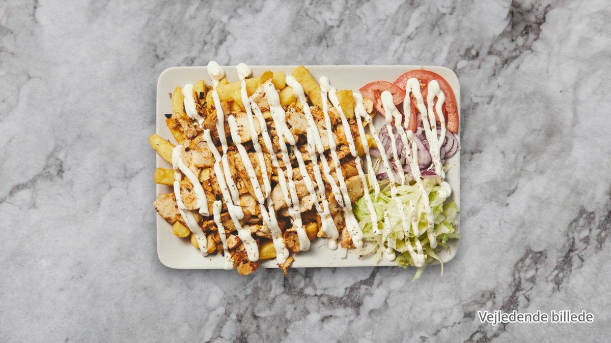 Serveret med salat, pommes frites og hvidløgsdressing.