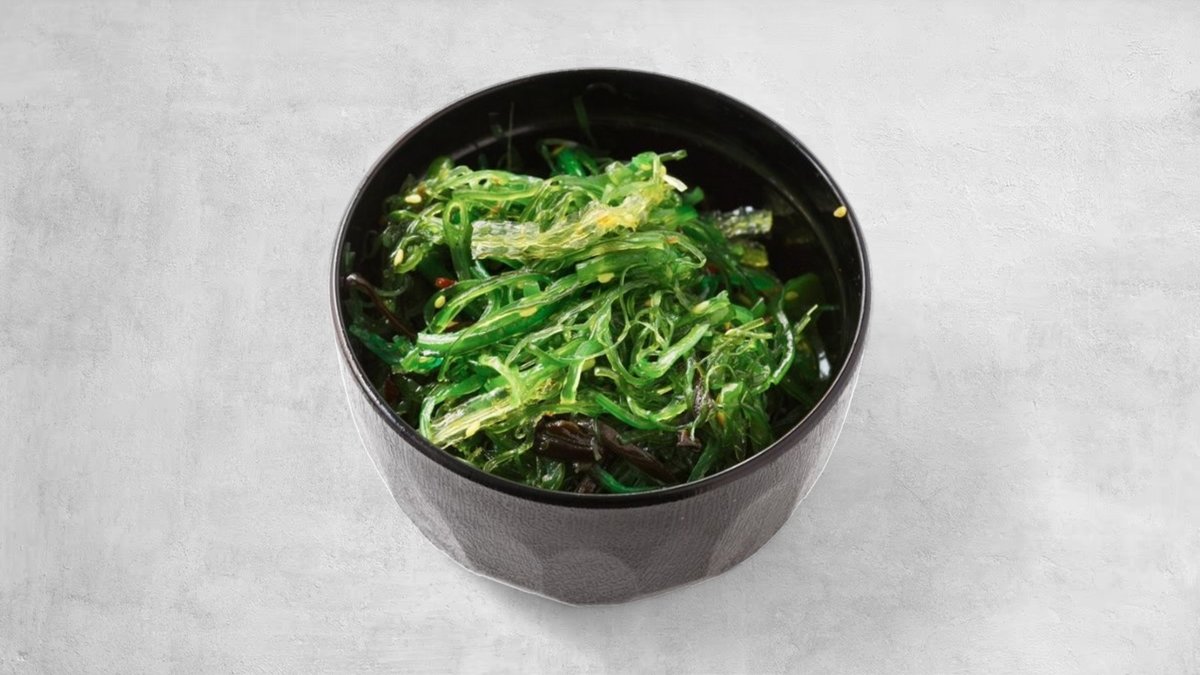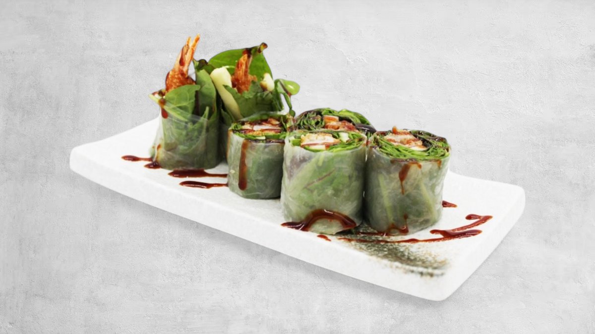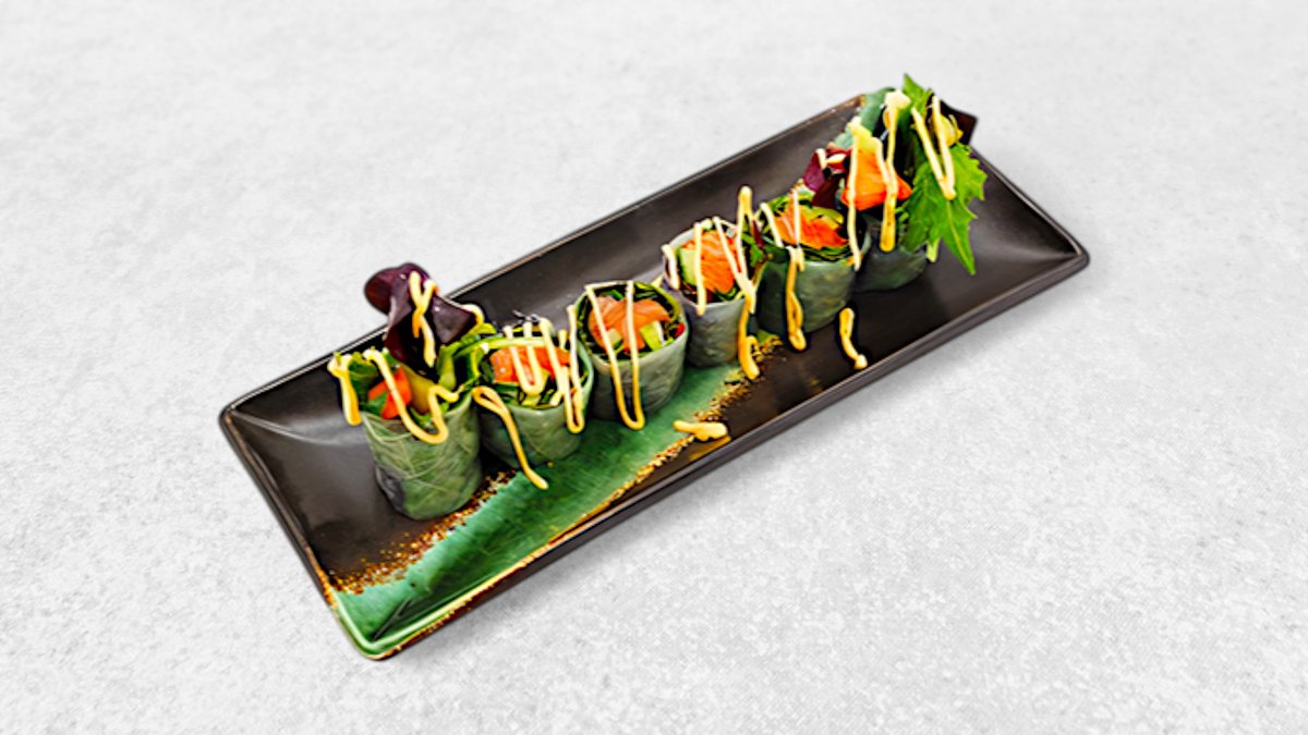 Salatmix, rødkål, majs, radiser, lime, mango, tangsalat, agurk, edamamebønner, avocado, gulerødder og tofu på en bund af sushiris. Toppes med gomadressing, teriyaki og sesam.