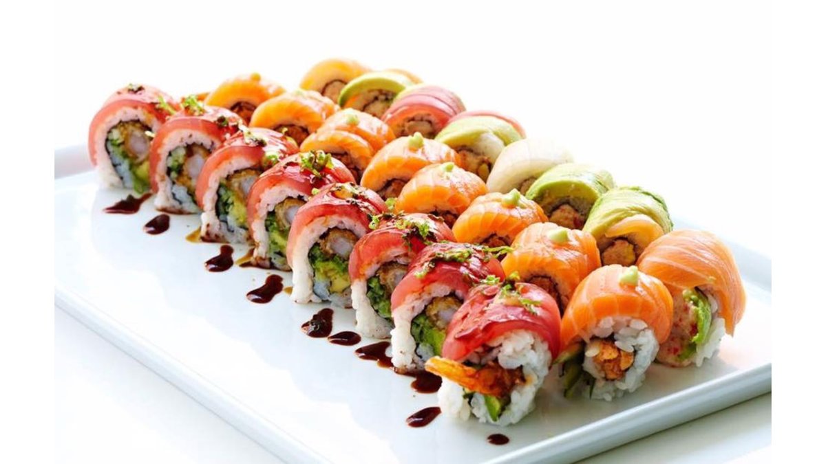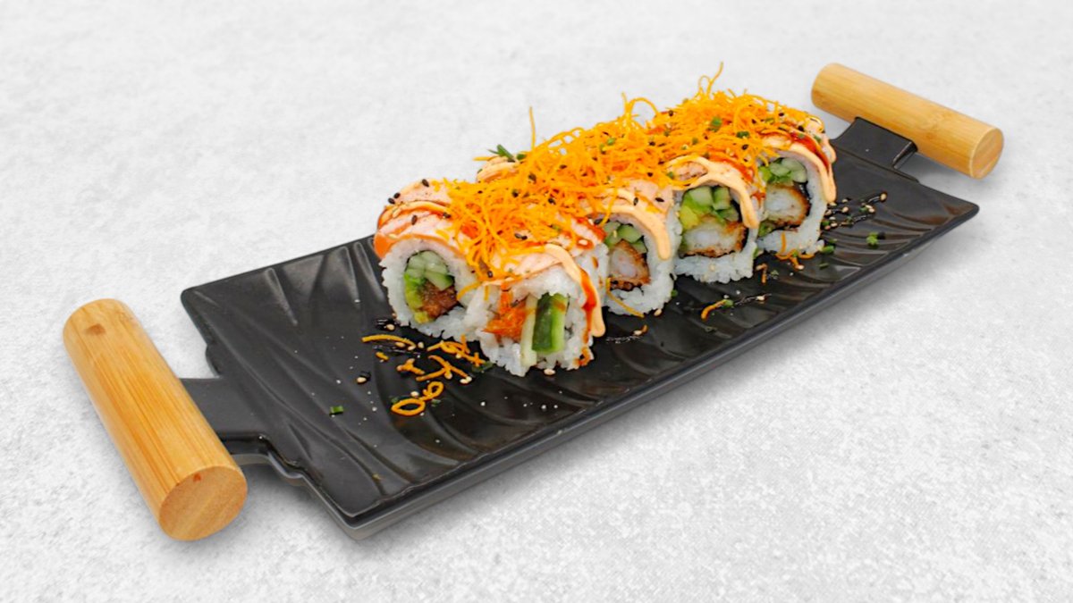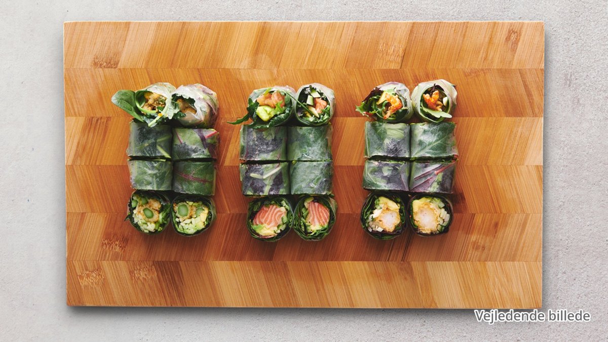Uramaki: 8 x California 8 x tempura-reje 8 x tempura-kylling Kaburimaki: 8 x Rainbow