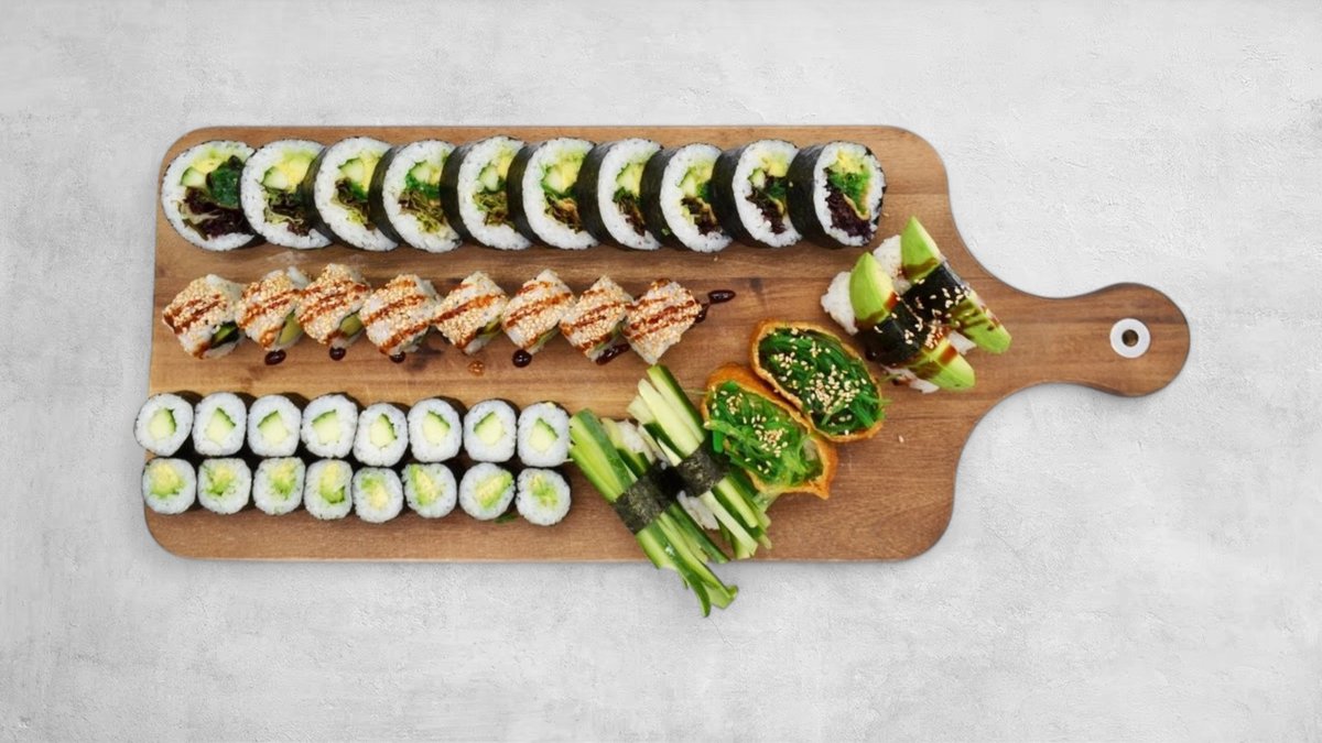 Nigiri: 2 x tofu 2 x avocado 2 x agurk Uramaki: 8 x avocado Hosomaki: 8 x agurk 8 x avocado Futomaki: 10 x grøntsager