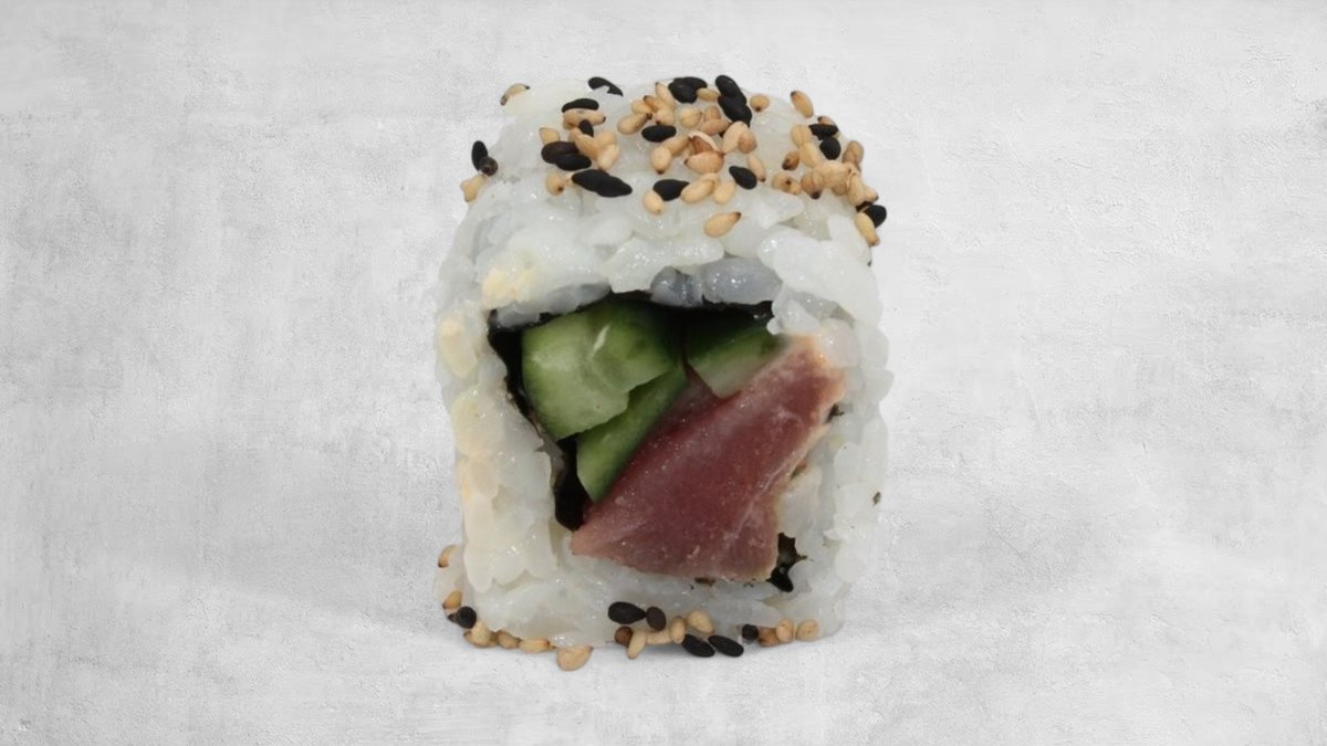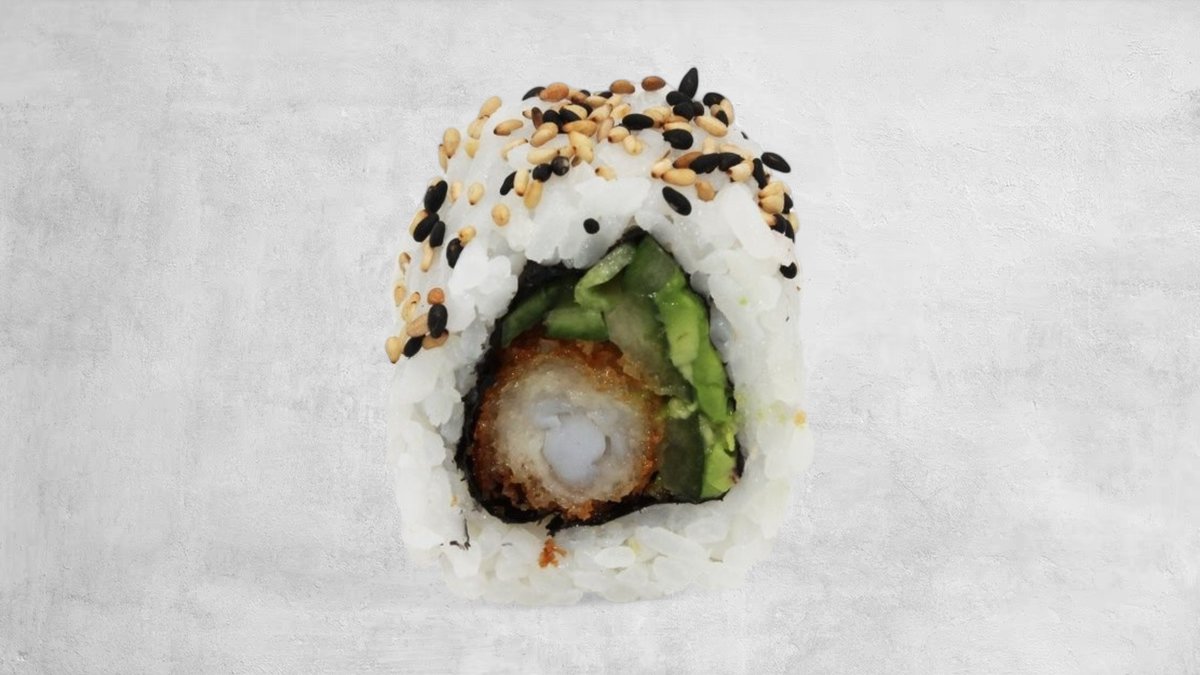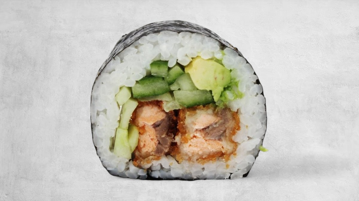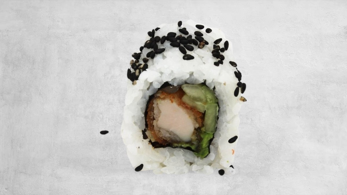 Dybstegt kylling, avocado, agurk, sesam og teriyaki-sauce.