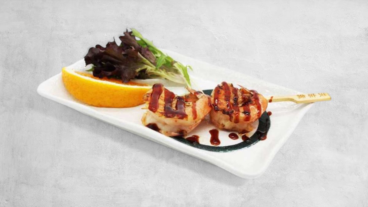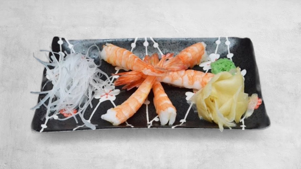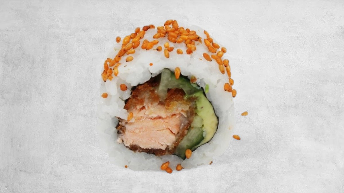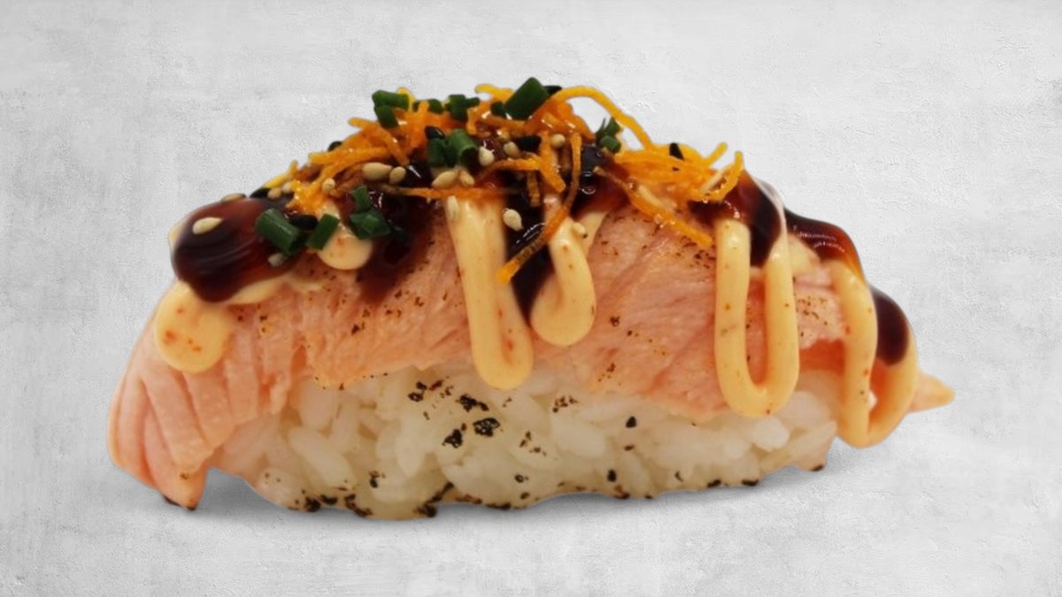 Toppet uramaki: 8 x Tempurarejer, agurk, avocado med flamberet laks på toppen. Nigiri: 2 x Laks.