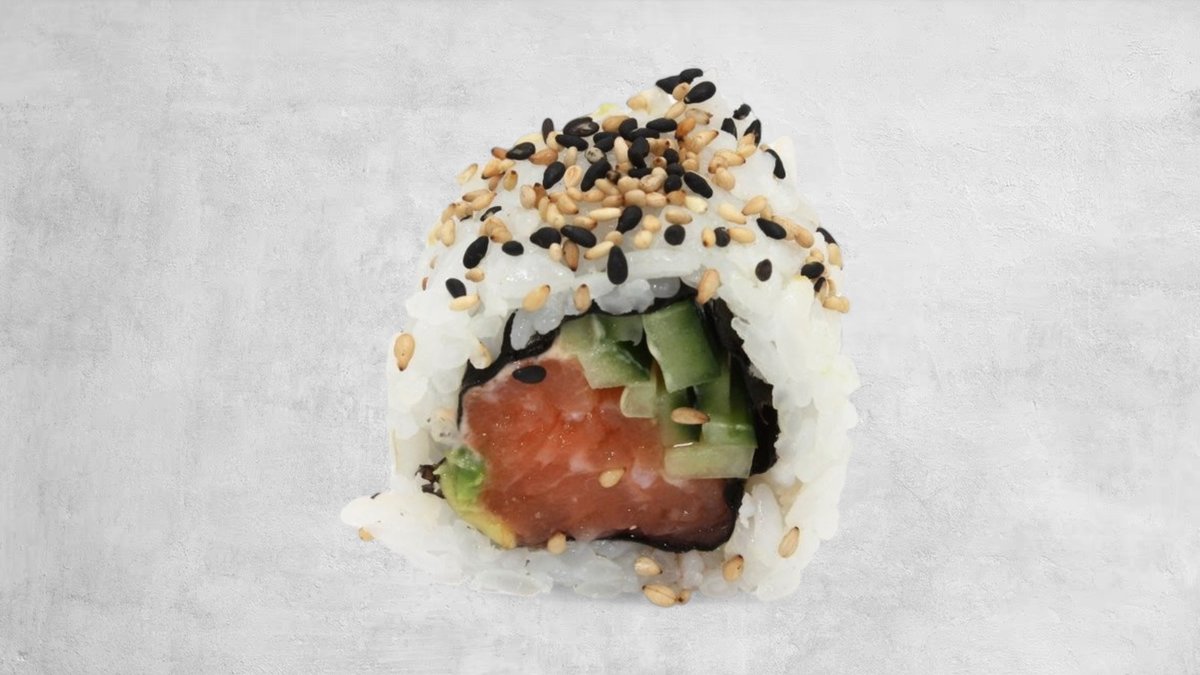 Toppet uramaki : 8 stk. tempurarejer, agurk, avocado m. flamberet laks på topping. INSIDE-OUT: 4 laks