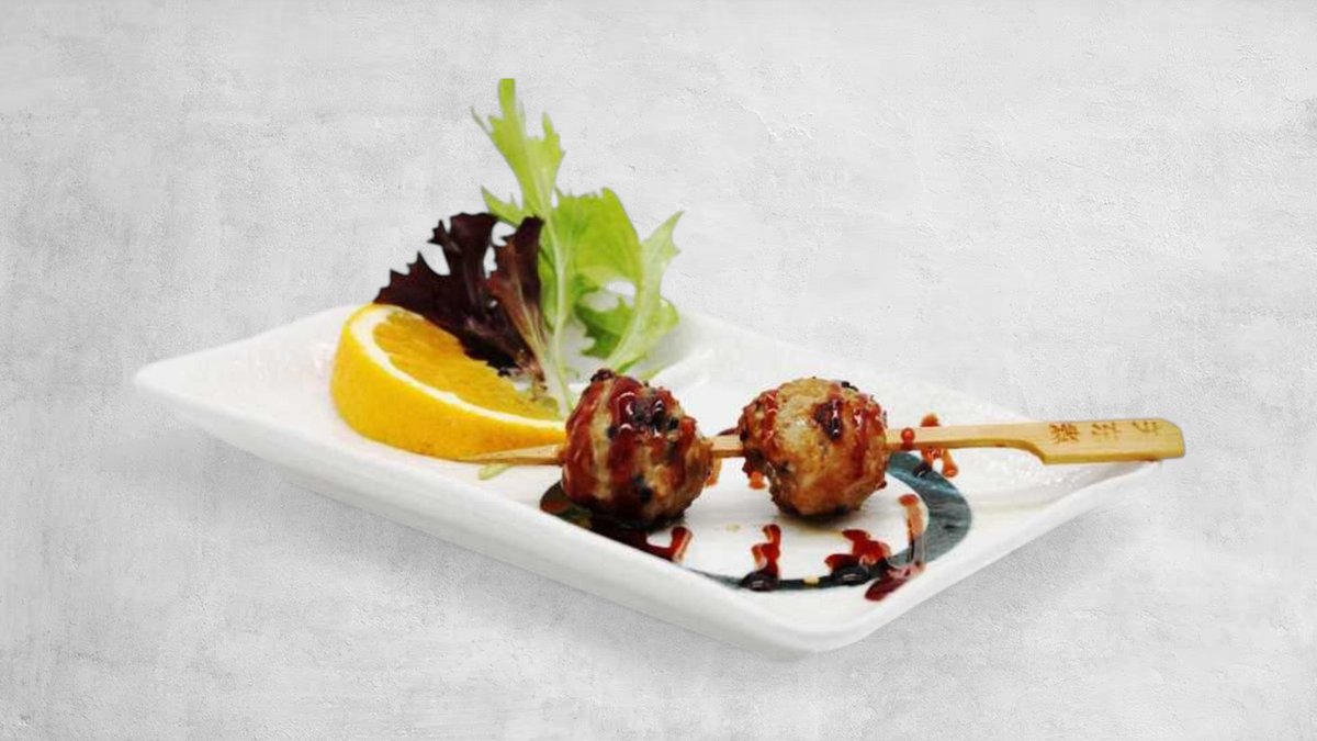 Japanske ris, kyllingekødboller og 1 stick med laks.