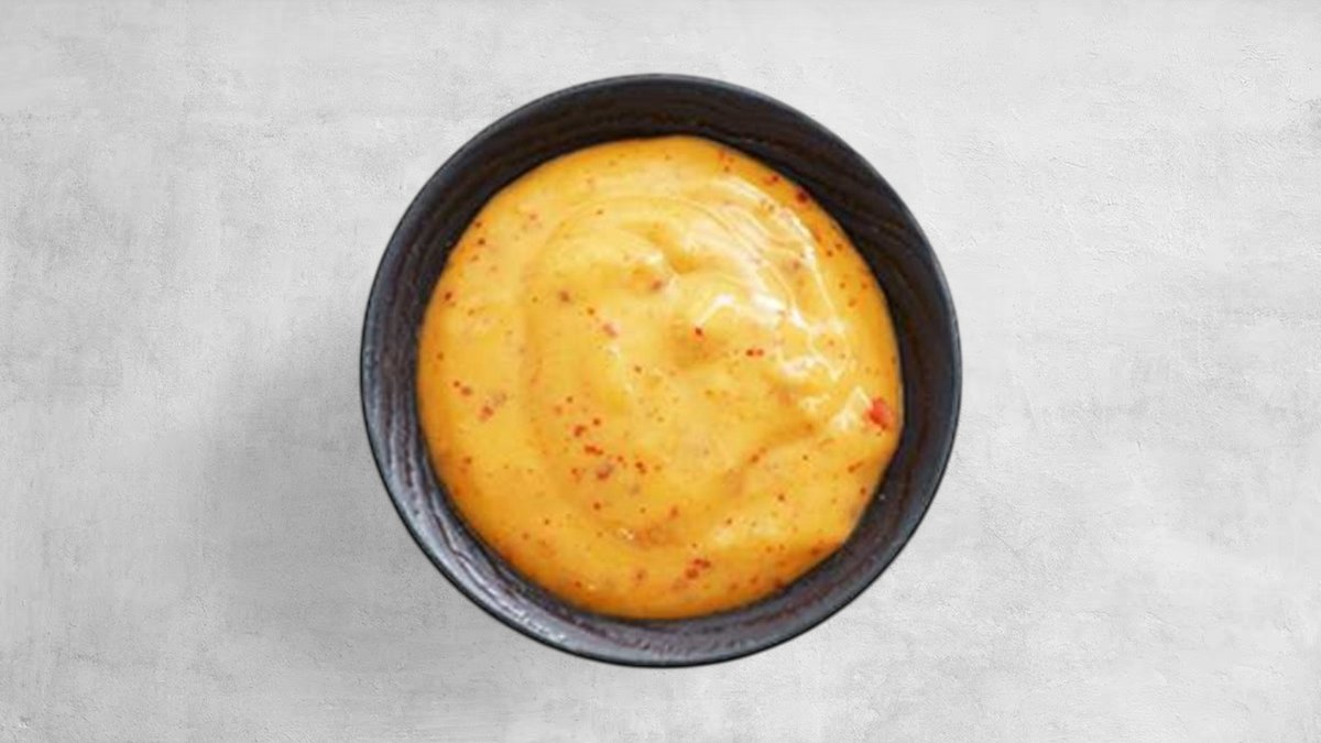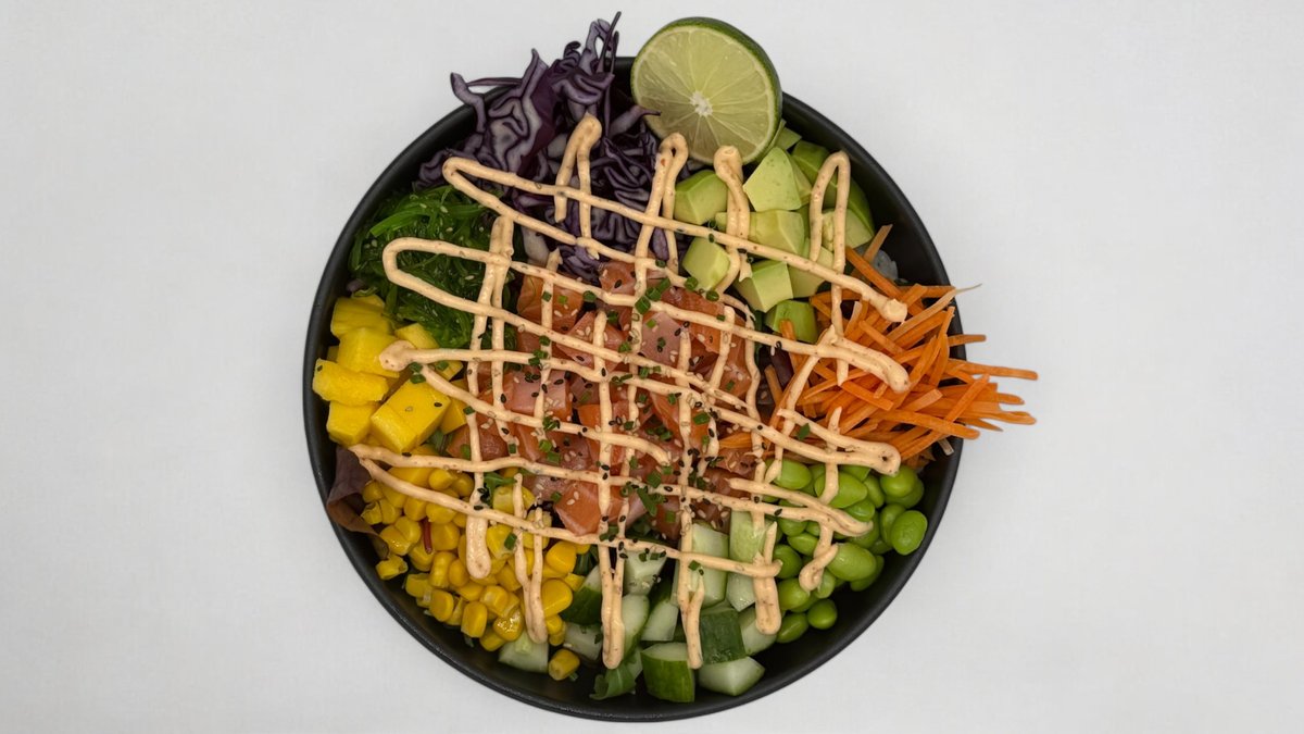 Salatmix, rødkål, lime, mango, majs, radiser, tangsalat, agurk, edamamebønner, avocado, gulerødder og flamberet laks på en bund af sushiris. Toppes med pokesauce, chilimayo og chili sesam.