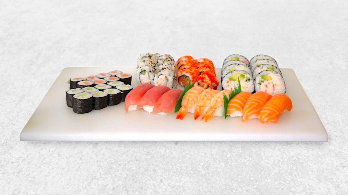 Nigiri: 4 x tofu 4 x laks 4 x tun 4 x hvidfisk 4 x rejer Uramaki: 8 x spicy laks 8 x tempura-rejer 8 x tempura-kylling 8 x Spicy tun