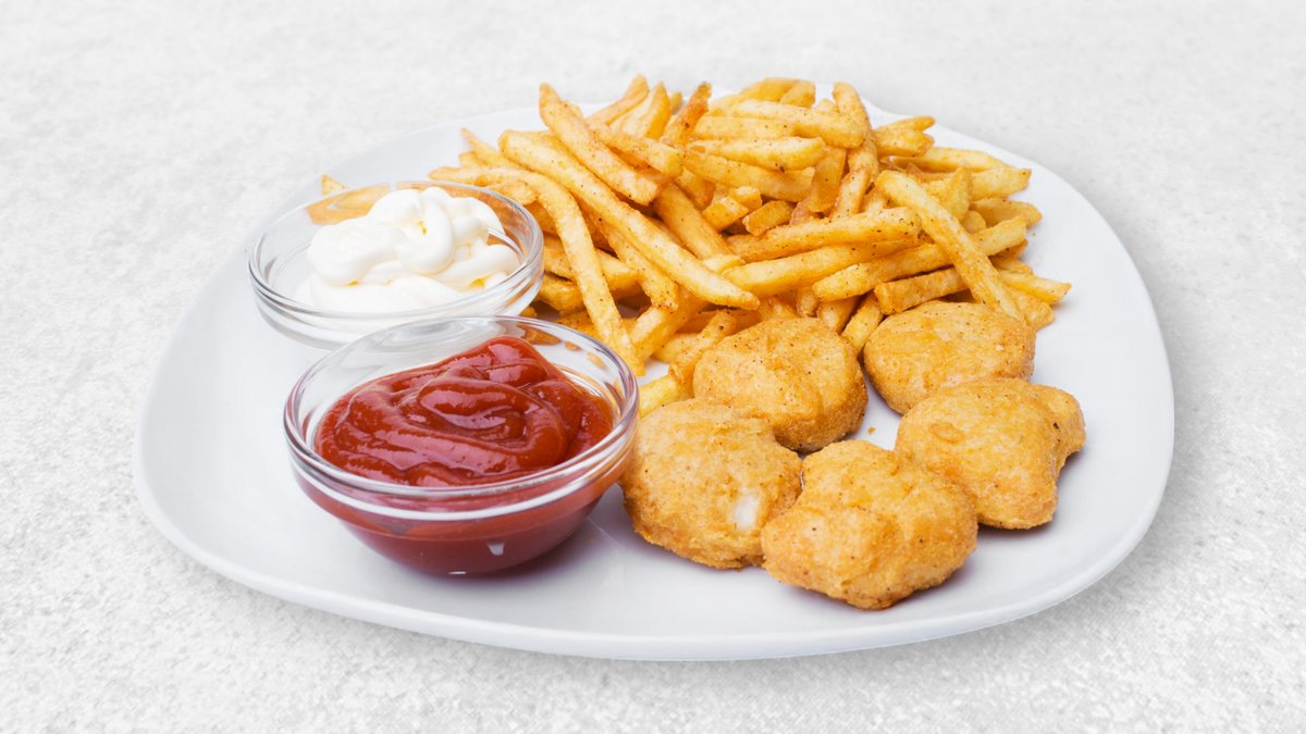 Serveres med pommes frites, én valgfri dip og én valgfri dåsesodavand.